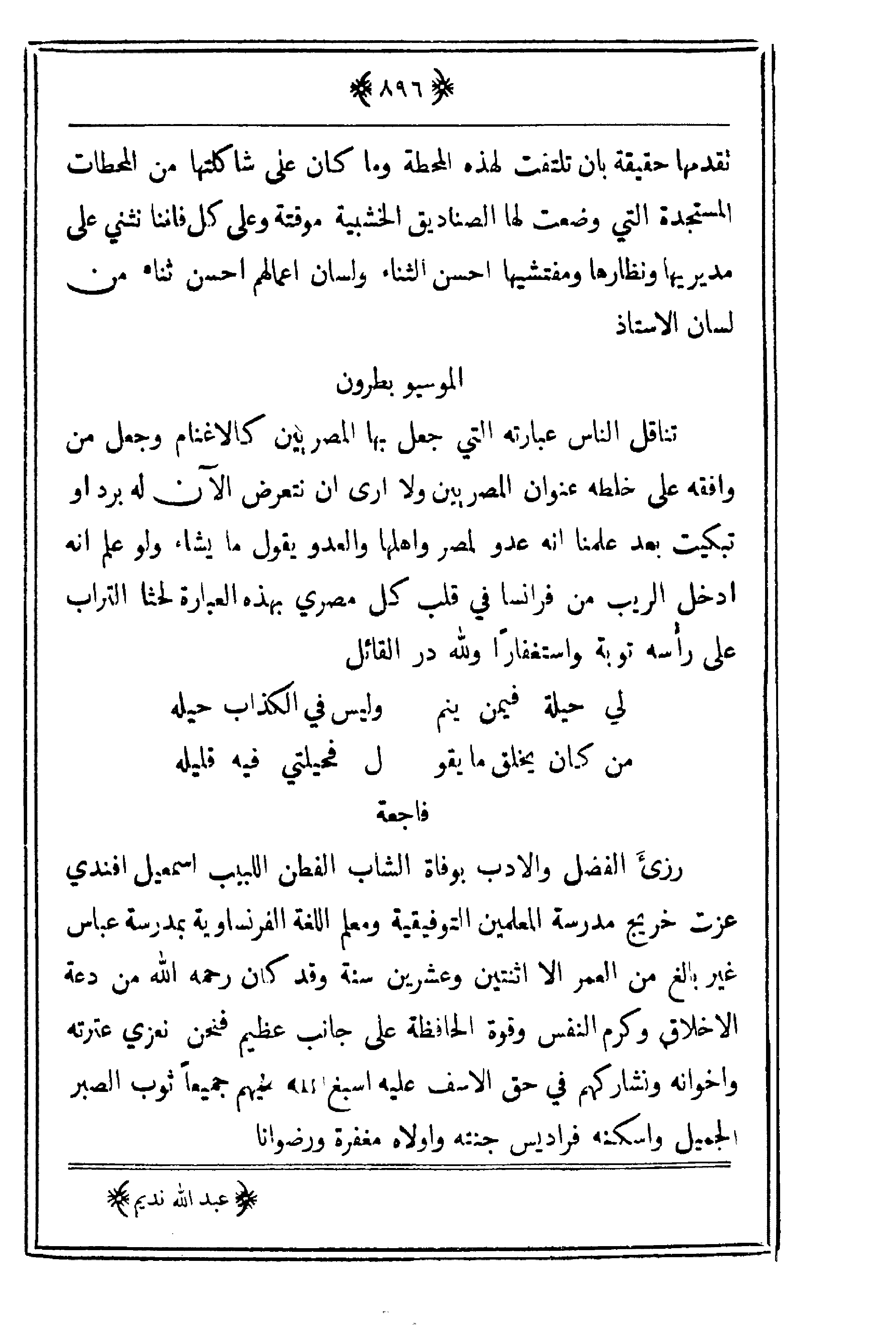 رزئ الفضل والأدب بوفاة الشاب الفطن اللبيب إسماعيل أفندي عزت خريج مدرسة المعلمين التوفيقية ومعلم اللغة الفرنساوية بمدرسة عباس غير بالغ من العمر إلا اثنتين وعشرين سنة وقد كان رحمه الله من دعة الأخلاق وكرم النفس وقوة الحافظة على جانب عظيم فنحن نعزي عترته وإخوانه ونشاركهم في حق الأسف عليه أسبغ عليهم جميعاً ثوب الصبر الجميل وأسكنه فراديس جنته وأولاده مغفرة ورضوانا.