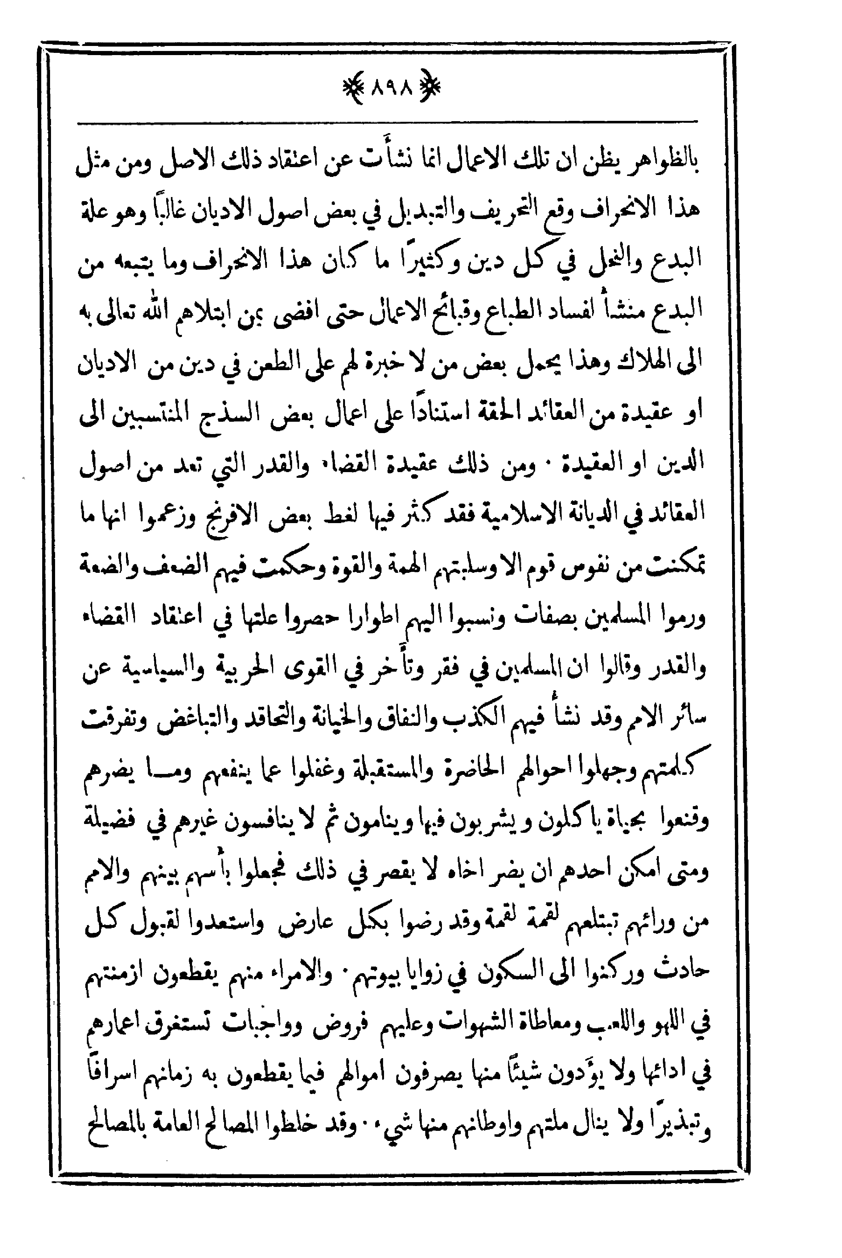 بالظواهر يظن أن تلك الأعمال إنما نشأت عن اعتقاد ذلك الأصل ومن مثل هذا الانحراف وقع التحريف والتبديل في بعض أصول الأديان غالباً وهو علة البدع والنحل في كل دين وكثيراً ما كان هذا الانحراف وما يتبعه من البدع منشأ لفساد الطباع وقبائح الأعمال حتى أفضى بمن ابتلاهم الله تعالى به إلى الهلاك وهذا يحمل بعض من لا خبرة لهم على الطعن في دين من الأديان أو عقيدة من العقائد ألحقة استناداً على أعمال بعض السذج المنتسبين إلى الدين أو العقيدة. ومن ذلك عقيدة القضاء والقدر التي تعد من أصول العقائد في الديانة الإسلامية فقد كثر فيها لغط بعض الإفرنج وزعموا أنها ما تمكنت من نفوس قوم إلا وسلبتهم الهمة والقوة وحكمت فيهم الضعف والضعة ورموا المسلمين بصفات ونسبوا إليهم أطوارا حصروا علتها في اعتقاد القضاء والقدر وقالوا أن المسلمين في فقر وتأخر في القوى الحربية والسياسية عن سائر الأمم وقد نشأ فيهم الكذب والنفاق والخيانة والتحاقد والتباغض وتفرقت كلمتهم وجهلوا أحوالهم الحاضرة والمستقبلة وغفلوا عما ينفعهم وما يضرهم وقنعوا بحياة يأكلون ويشربون فيها وينامون ثم لا ينافسوا غيرهم في فضيلة ومتى أمكن أحدهم أتن يضر أخاه لا يقصر في ذلك فجعلوا بأسهم بنهم والأمم من ورائهم تبتلعهم لقمة لقمة وقد رضوا بكل عارض واستعدوا لقبول كل حادث وركنوا إلى السكون في زوايا بيتهم. والأمراء منهم يقطعون أزمنتهم في اللهو واللعب ومعاطاة الشهوات وعليهم فروض وواجبات تستغرق أعمارهم في
