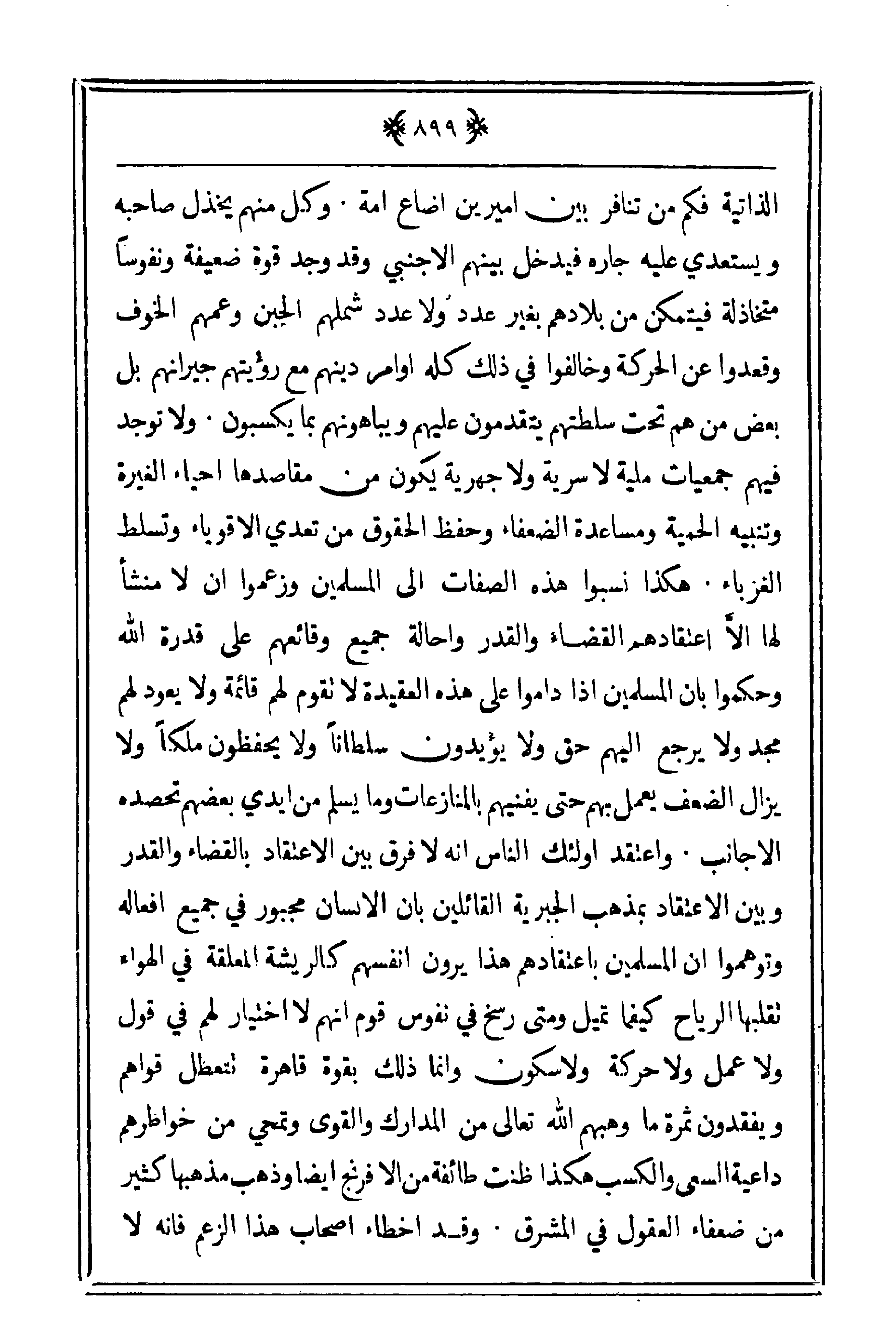 الذاتية فكم من تنافر بين أميرين أضاع أمة. وكل منهم يخذل صاحبه ويستعدي عليه جاره فيدخل بينهم الأجنبي وقد وجد قوة ضعيفة ونفوساً متخاذلة فيتمكن من بلادهم بغير عدد ولا عدد شملهم الجبن وعمهم الخوف وقعدوا عن الحركة وخالفوا في ذلك كله أوامر دينهم مع رؤيتهم جيرانهم بل بعضه من هم تحت سلطتهم يتقدمون عليهم ويباهونهم بما يكسبون. ولا توجد فيهم جمعيات ملية لا سرية ولا جهرية يكون من مقاصدها أحياء الغيرة وتنبيه الحمية ومساعدة الضعفاء وحفظ الحقوق من تعدي الأقوياء وتسلط الغرباء. هكذا نسبوا هذه الصفات إلى المسلمين وزعموا أن لا منشأ لها إلاّ اعتقادهم القضاء والقدر وإحالة جميع وقائعهم على قدرة الله وحكموا بأن المسلمين إذا داموا على هذه العقيدة لا تقوم لهم قائمة ولا يعود لهم مجد ولا يرجع إليهم حق ولا يؤيدون سلطاناً ولا يحفظون ملكاً ولا يزال الضعف يعمل بهم حتى يفنيهم بالمنازعات وما يسلم من أيدي بعضهم تحصده الأجانب. واعتقد أولئك الناس أنه لا فرق بين الاعتقاد بالقضاء والقدر وبين الاعتقاد بمذهب الجبرية القائلين بأن الإنسان مجبور في جميع أفعاله وتوهموا أن المسلمين باعتقادهم هذا يرون أنفسهم كالريشة المعلقة في الهواء تقلبها الرياح كيفما تميل ومتى رسخ في نفوس قوم أنهم لا اختيار لهم في قول ولا عمل ولا حركة ولا سكون وإنما ذلك بقوة قاهرة تتعطل قواهم ويفقدون ثمرة ما وهبهم الله تعالى من المدارك والقوى وتمحي من خواطرهم داعية السعي والكسب هكذا ظنت طائفة من الإفرنج أيضاً وذهب مذهبها كثير من ضفعاء العقول في المشرق. وقد أخطاء أصحاب هذا الزعم فإنه لا
