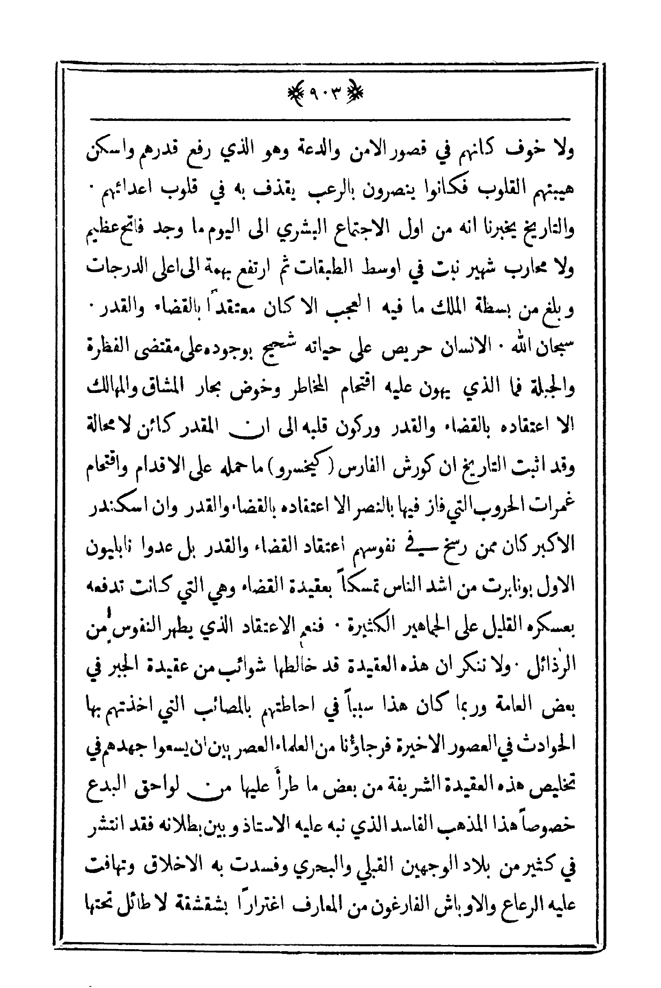 قلبه إلى أن المقدر كائن لا محالة وقد أثبت التاريخ أن كورش الفارس (كيخسرو) ما حمله على الأقدام واقتحام غمرات الحروب التي فاز فيها بالنصر إلا اعتقاده بالقضاء والقدر وإن اسكندر الأكبر كان ممن رسخ في نفوسهم اعتقاد القضاء والقدر بل عدو نابليون الأول بونابرت من أشد الناس تمسكاً بعقيدة القضاء وهي التي كانت تدفعه فعسكره القليل على الجماهير الكثيرة. فنعم الاعتقاد الذي يطهر النفوس من الرذائل. ولا ننكر أن هذه العقيدة قد خالطها شوائب من عقيدة الجبر في بعض العامة وربما كان هذا سبباً في أحاطتهم بالمصائب التي أخذتهم بها الحوادث في العصور الأخيرة فرجاؤنا من العلماء العصريين أن يسعوا جهدهم في تخليص هذه العقيدة الشريفة من بعض ما طرأ عليها من لواحق البدع خصوصاً هذا المذهب الفاسد الذي نبه عليه الأستاذ وبين بطلانه فقد انتشر في كثير من بلاد الوجهين القبلي والبحري وفسدت به الأخلاق وتهافت عليه الرعاع والأوباش الفارغون من المعارف اغتراراً بشقشقة لا طائل تحتها