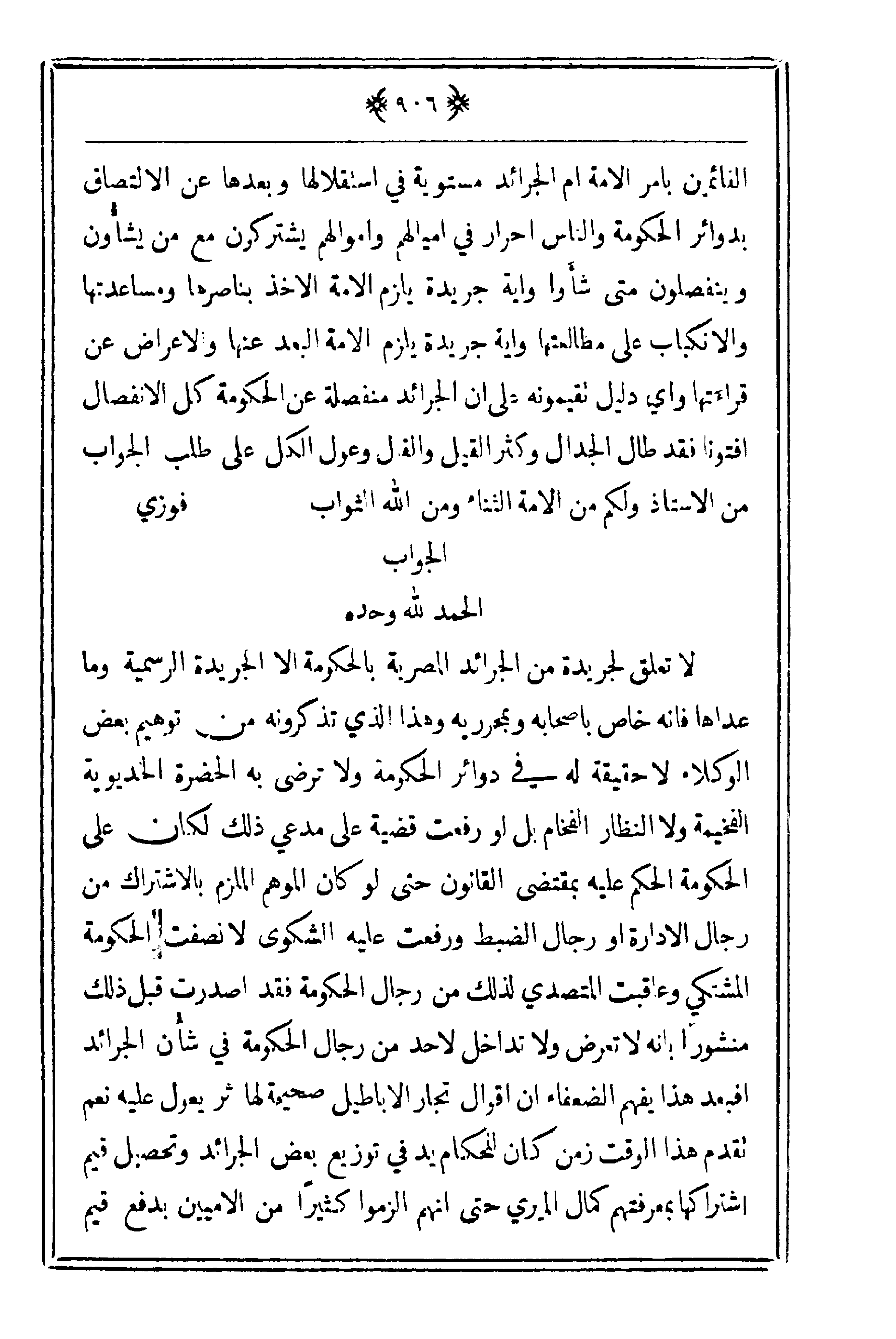 القائمين بأمر الأمة أم الجرائد مستوية في استقلالها وبعدها عن الالتصاق بدوائر الحكومة والناس أحرار في أميالهم وأموالهم يشتركون مع من يشأون وينفصلون متى شأوا وأية جريدة يلزم الأمة الأخذ بناصرها ومساعدتها والانكباب على مطالعتها وأية جريدة يلزم الأمة البعد عنها والإعراض عن قراءتها وأي دليل تقيمونه على أن الجرائد منفصلة عن الحكومة كل الانفصال أفتونا فقد طال الجدال وكثر القيل والقال وعول الكل على طلاب الجواب من الأستاذ ولكم من الأمة الثناء ومن الله الثواب.