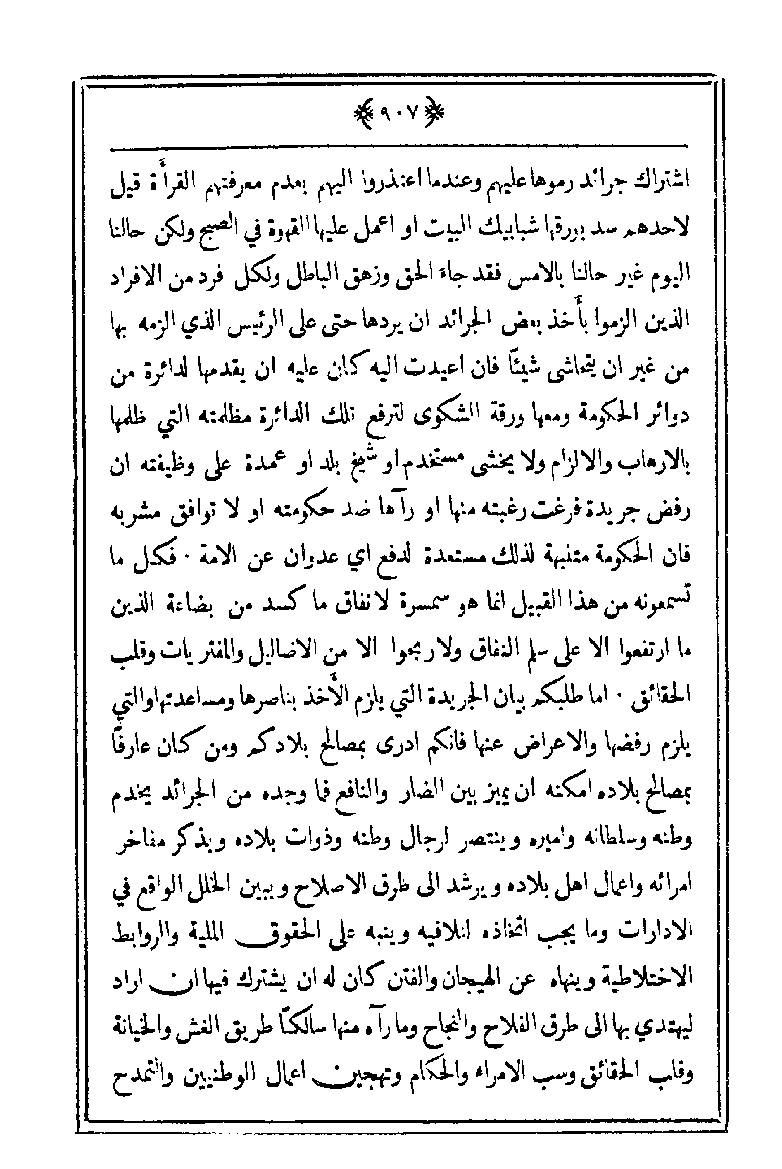 بأخذ بعض الجرائد أن يردها حتى على الرئيس الذي ألزمه بها من غير أن يتحاشى شيئاً فإن أعيدت إلهي كان عليه أن يقدمها لدائرة من دوائر الحكومة ومعها ورقة الشكوى لترفع تلك الدائرة مظلمته التي ظلمها بالإرهاب والإلزام ولا يخشى مستخدم أو شيخ بلد أو عمدة على وظيفته أرفض جريدة فرغت رغبته منها أو رآها ضد حكومته أو لا توافق مشربه فإن الحكومة متنبهة لذلك مستعدة لدفع أي عدوان عن الأمة. فكل ما تسمعونه من هذا القبيل إنما هو سمسرة لإنفاق ما كسد من بضاعة الذين ما ارتفعوا إلا على سلم النفاق ولا ربحوا إلا من الأضاليل والمفتريات وقلب الحقائق. أما طلبكم بيان الجريدة التي يلزم الأخذ بناصرها ومساعدتها والتي يلزم رفضها والإعراض عنها فإنكم أدرى بمصالح بلادكم ومن كان عارفاً بمصالح بلاده أمكنه أيميز بين الضار والنافع فما وجده من الجرائد يخدم وطنه وسلطانه وأميره وينتصر لرجال وطنه وذوات بلاده ويذكر مفاخر أمرائه وأعمال أهل بلاده نويرشد على طرق الإصلاح ويبين الخل الواقع في الإدارات وما يجب اتخاذه لتلافيه وينبه على الحقوق الملية والروابط الاختلاطية وينهاه عن الهيجان والفتن كان له أن يشترك فيها أن أراد ليهتدي بها إلى طرق الفلاح والنجاح وما رآه منها سالكاً طريق الغش والخيانة وقلب الحقائق وسب الأمراء والحكام وتهجين أعمال الوطنيين والتمدح