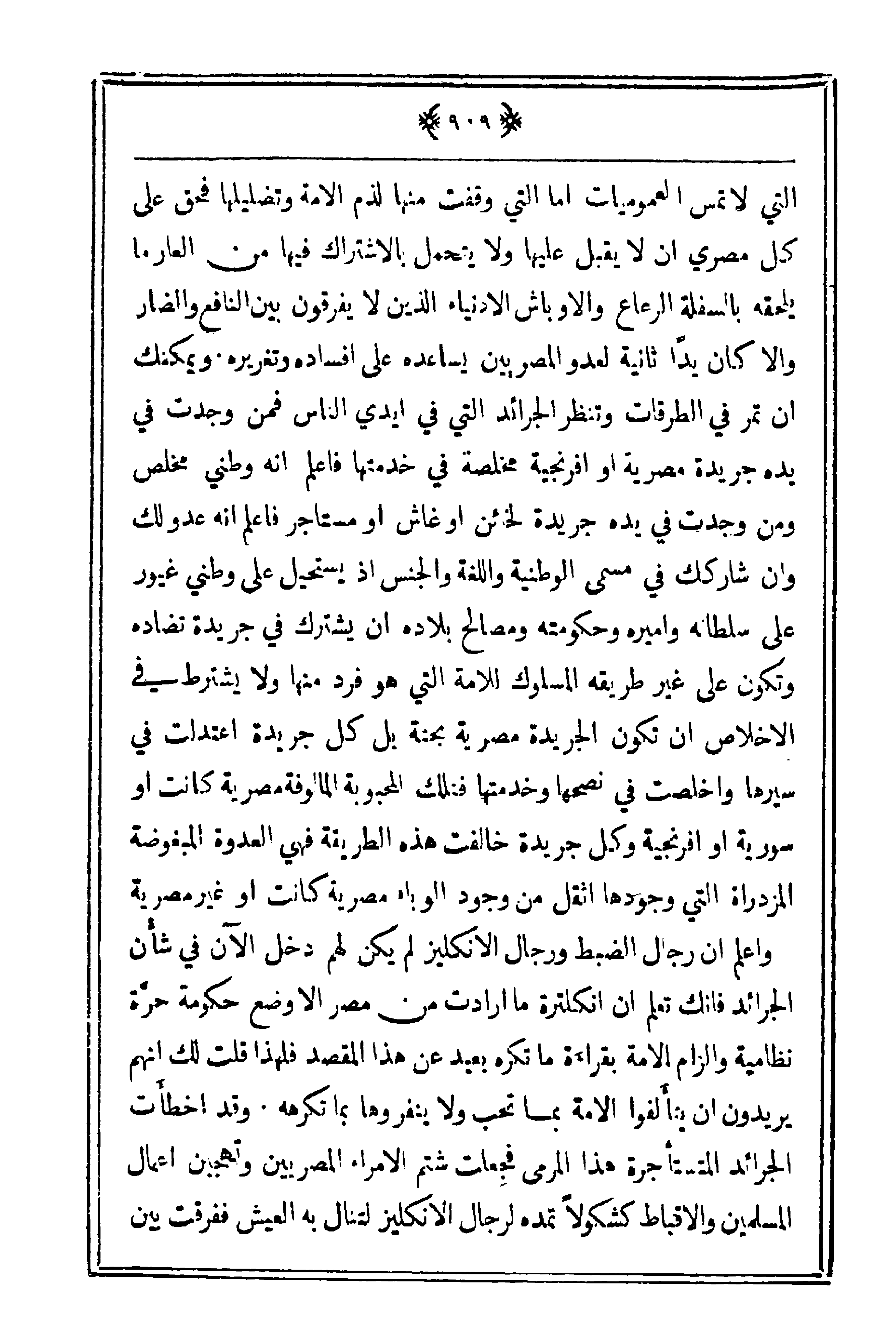 التي لا تمس العموميات أما التي وقفت منها لذم الأمة وتضليلها فحق على كل مصري أن لا يقبل عليها ولا يتحمل بالاشتراك فيها من العار ما يلحقه بالسفلة الرعاع والأوباش الأدنياء الذين لا يفرقون بين النافع والضار وإلا كان يداً ثانية لعدو المصريين يساعده على إفساده وتغريره. ويمكنك أن تمر في الطرقات وتنظر الجرائد التي في أيدي الناس فمن وجدت في يده جريدة مصرية أو إفرنجية مخلصة في خدمتها فاعلم انه وطني مخلص ومن وجدت في يده جريدة لخائن أو غاش أو مستأجر فأعلم أنه عدو لك وإن شاركك في مسمى الوطنية واللغة والجنس إذ يستحيل على وطني غيور على سلطانه وأميره وحكومته ومصالح بلاده أن يشترك في جريدة تضاده وتكون على غير طريقه المسلوك للأمة التي هو فرد منها ولا يشترط في الإخلاص أن تكون الجريدة مصرية بحتة بل كل جريدة اعتدلت في سيرها وأخلصت في نصحها وخدمتها فتلك المحبوبة المألوفة مصري كانت أو سورية أو إفرنجية وكل جريدة خالفت هذه الطريقة فهي العدوة المبغوضة المزدراة التي وجودها أثقل من وجود الوباء مصرية كانت أو غير مصرية وأعلم أن رجال الضب ورجال الإنكليز لم يكن لهم دخل الآن في شأن الجرائد فإنك تعلم أن أنكلترة ما أرادت من مصر إلا وضع حكومة حرّة نظامية وإلزام الأمة بقراءة ما تكره بعيد عن هذا المقصد فلهذا قلت لك أنهم يريدون أن يتألفوا الأمة بما تحب ولا ينفروها بما تكرهه. وقد أخطأت الجرائد المستأجرة هذا المرمى فجعلت شتم الأمراء المصريين وتهجين أعمال المسلمين والأقباط كشكولاً تمده لرجال الإنكليز لتنال به العيش ففرقت بين