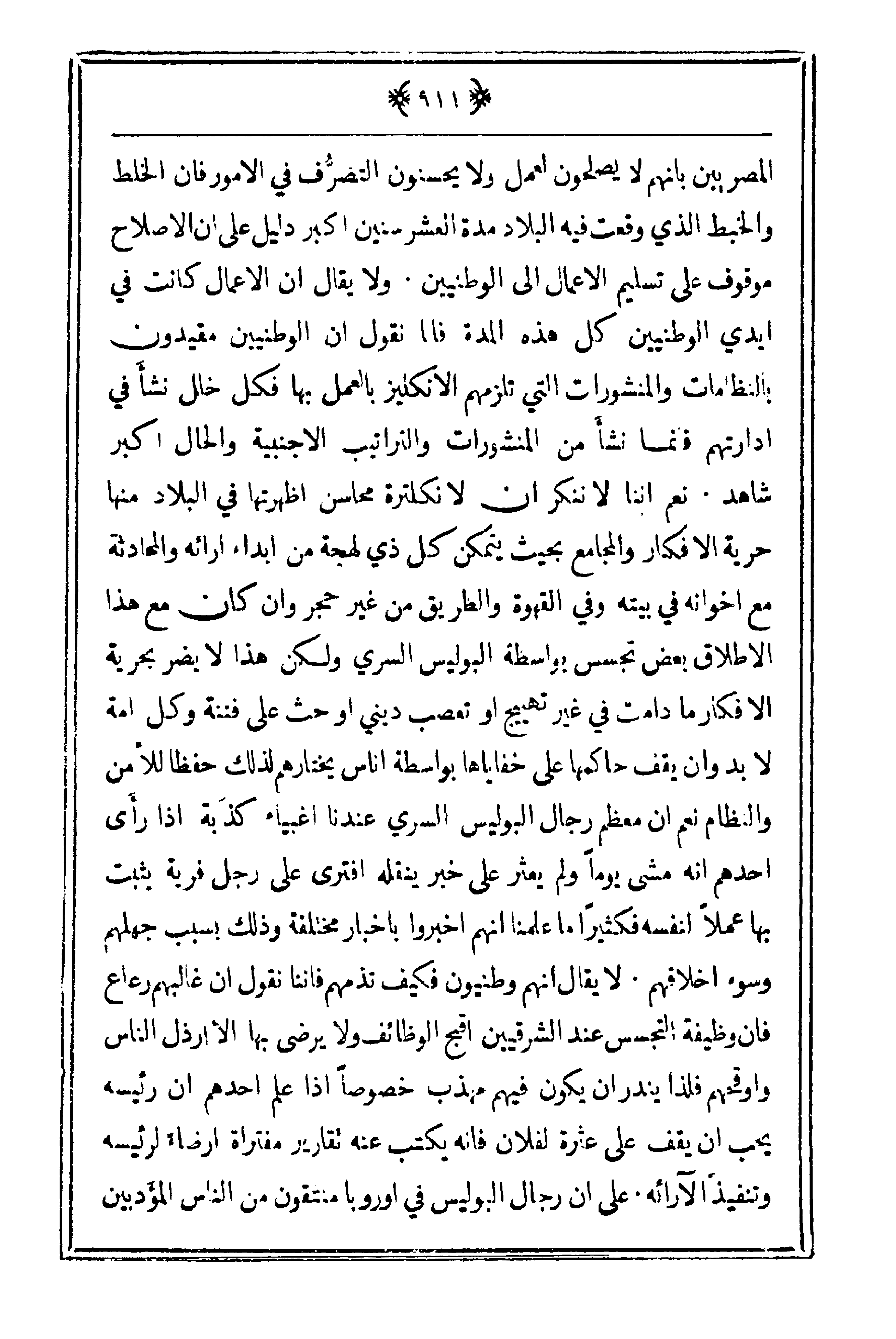 المصريين بأنه لا يصلحون لعمل ولا يحسنون التصرُّف في الأمور فإن الخلط والخبط الذي وقعت فيه البلاد مدة العشر سنين أكبر دليل على أن الإصلاح موقوف على تسليم الأعمال إلى الوطنيين. ولا يقال أن الأعمال كانت في أيدي الوطنيين كل هذا المدة فإنا نقول أن الوطنيين مقيدون بالنظامات والمنشورات التي تلزمهم الإنكليز بالعمل بها فكل خلل نشأ في إدارتهم فإنما نشأ من المنشورات والتراتيب الأجنبية والحال أكبر شاهد. نعم أننا لا ننكر أن لإنكلترة محاسن أظهرتها في البلاد منها حرية الأفكار والمجامع بحيث يتمكن كل ذي لهجة من إبداء آرائه والمحادثة مع إخوانه في بيته وفي القهوة والطريق من غير حجر وإن كل مع هذا الإطلاق بعض تجسس بواسطة البوليس السري ولكن هذا لا يضر بحرية الأفكار ما دامت في غير تهييج أو تعصب ديني أو حث على فتنة وكل أمة لابد وأن يقف حاكمها على خفاياها بواسطة أناس يختارهم لذلك حفظاً للأمن والنظام نعم أن معظم رجال البوليس السري عندنا أغبياء كذبة إذا رأى أحدهم أنه مشى يوماً ولم يعثر على خبر ينقله افترى على رجل فرية