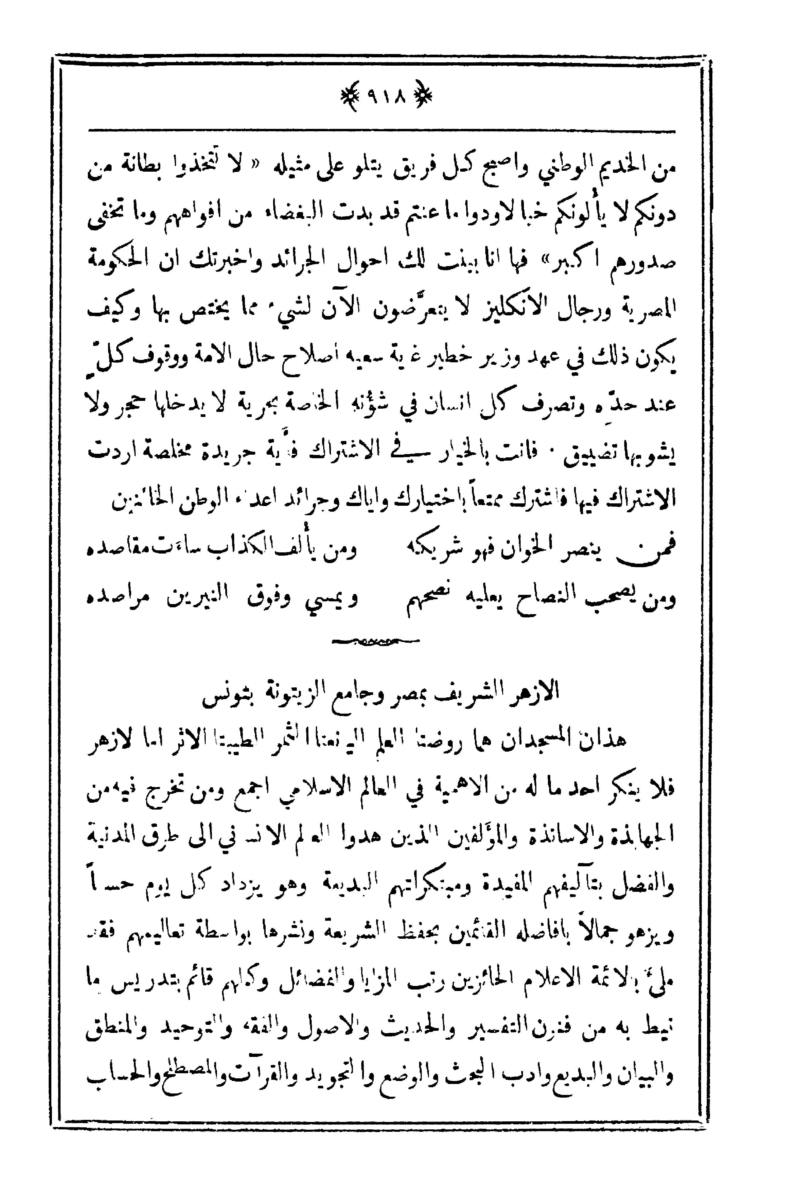 هذان المسجدان هما روضتا العلم اليانعتا الثمر الطيبتا الأثر أما الأزهر فلا ينكر أحد ما له من الأهمية في العالم الإسلامي أجمع ومن تخرج فيه من الجهابذة والأساتذة والمؤلفين الذين هدوا العالم الإنساني إلى طرق المدنية والفضل بتأليفهم المفيدة ومبتكراتهم البديعة وهو يزداد كل يوم حسناً ويزهوا جمالاً بأفاضله القائمين بحفظ الشريعة ونشرها بواسطة تعاليمهم فقد ملئ بالأئمة الأعلام الحائزين رتب المزايا والفضائل وكلهم قائم بتدريس ما نيط به من فنون التفسير والحديث والأصول والفقه والتوحيد والمنطق والبيان والبديع وأدب البحث والوضع والتجويد والقرآت والمصطلح والحساب