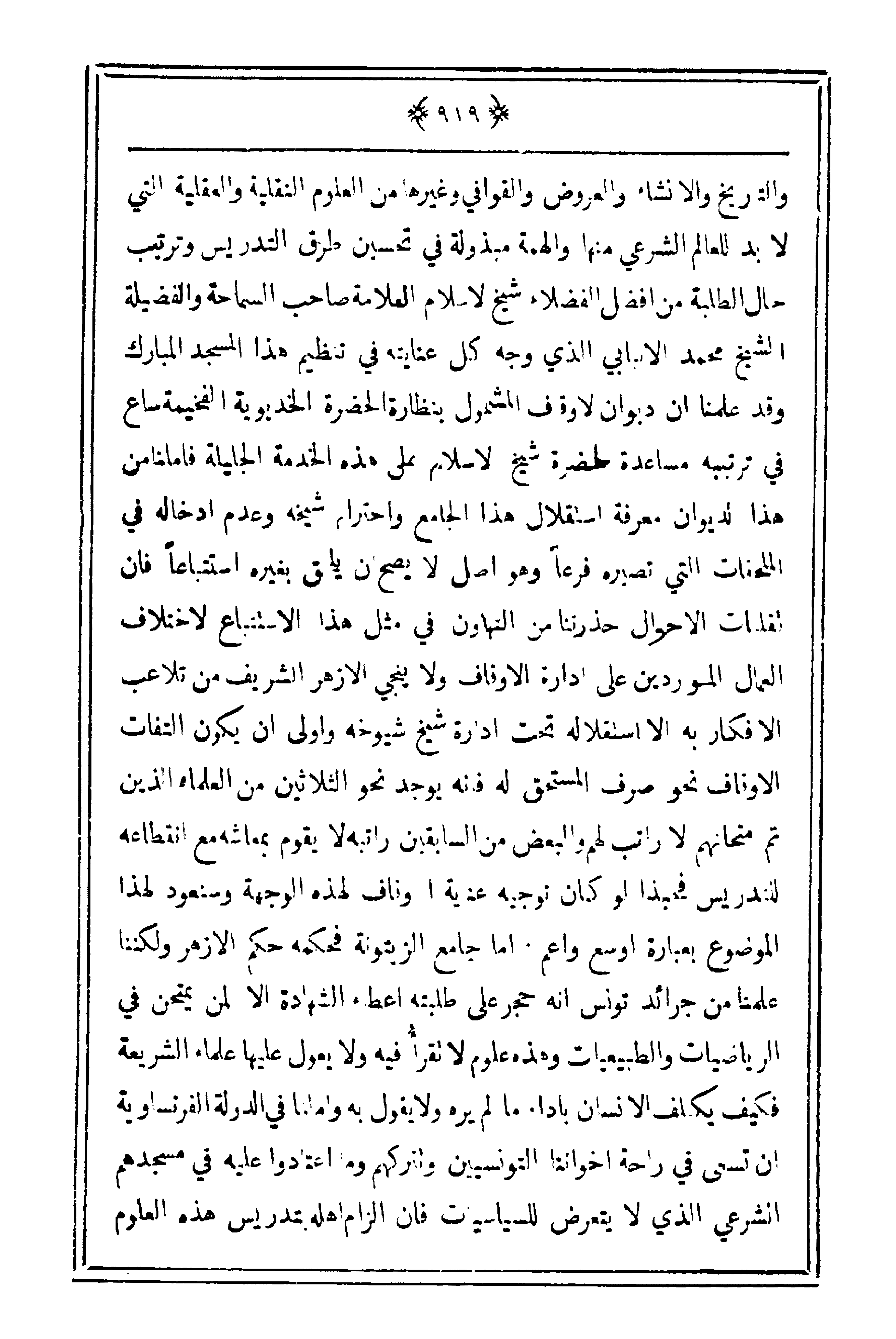 والتاريخ والإنشاء والعروض والقوافي وغيرها من العلوم النقلية والعقلية التي لابد للعالم الشرعي منها والهمة مبذولة في تحسين طرق التدريس وترتيب حال الطلبة من أفضل الفضلاء شيخ لإسلام العلامة صاحب السماحة والفضيلة الشيخ محمد الأنبابي الذي وجه كل عنايته في تنظيم هذا المسجد المبارك وقد علمنا أن ديوان لأوقاف المشمول بنظارة الحضرة الخديوية الفخيمة ساع في ترتيبه مساعدة لحضرة شيخ الإسلام على هذه الخدمة الجليلة فأملنا من هذا الديوان معرفة استقلال هذا الجامع واحترام شيخه وعدم إدخاله في الملحقات التي تصيره فرعاً وهو أصل لا يصح أن يلحق بغيره استتباعاً فإن تقلبات الأحوال حذرتنا من التهاون في مثل هذا الاستتباع لاختلاف العمال الموردين على إدارة الأوقاف ولا ينجي الأزهر الشريف من تلاعب الأفكار به إلا استقلاله تحت إدارة شيخ شيوخه وأولى أن يكون التفات الأوقاف نحو صرف المستحق له فإنه يوجد نحو الثلاثين من العلماء الذين تم امتحانهم لا راتب لهم والبعض من السابقين راتبه لا يقوم بمعاشه مع انقطاعه للتدريس فحبذا لو كان توجيه عناية أوقاف لهذه الوجهة وسنعود لهذا الموضوع بعبارة أوسع وأعم. أما جامع الزيتونة فحكمه حك الأزهر ولكننا علمنا من جرائد تونس أنه حجر على طلبته إعطاء الشهادة إلا لمن يمتحن في الرياضيات والطبيعيات وهذه علوم لا تقرأ فيه ولا يعول عليها علماء الشريعة فكيف يكلف الإنسان بأداء ما لم يره ولا يقول به وأملنا في الدولة الفرنساوية أن تسعى في راحة إخواننا التونسيين وتتركهم وما اعتادوا عليه في مسجدهم الشرعي الذي لا يتعرض للسياسيات فإن إلزام أهله بتدريس هذه العلوم