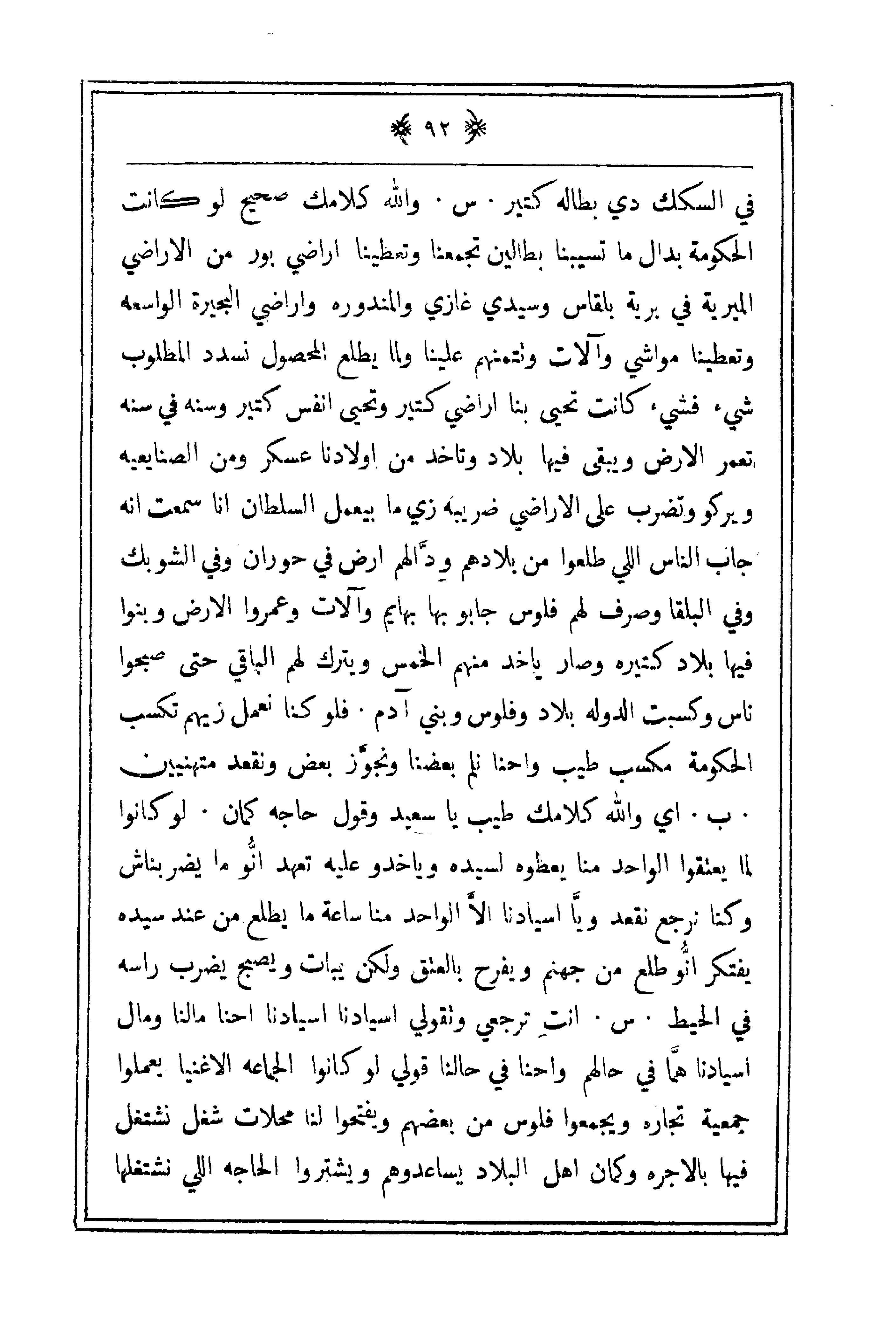 ويركو وتضرب على الأراضي ضريبه زي ما بيعمل السلطان أنا سمعت انه جاب الناس اللي طلعوا من بلادهم وِدّالهم أرض في حوران وفي الشوبك وفي البلقا وصرف لهم فلوس جابو بها بهايم وآلات وعمروا الأرض وبنوا فيها بلاد كتيره وصار ياخد منهم الخمس ويترك لهم الباقي حتى صبحوا ناس وكسبت الدولة بلاد وفلوس وبني آدم. فلو كنا نعمل زيهم تكسب الحكومة مكسب طيب واحنا نلم بعضنا وتجوَّز بعض ونقعد متهنيين. ب. أي والله كلامك طيب يا سعيد وقول حاجه كمان. لو كانوا لما يعتقوا الواحد منا يعطوه لسيده وياخدو عليه تعهد انّو ما يضربناش وكنا نرجع نقعد ويّا أسيادنا إلا الواحد منا ساعة ما يطلع من عند سيده يفتكر انُّو طلع من جهنم ويفرح بالعتق ولكن يبات ويصبح يضرب راسه في الحيط. س. انت ترجعي وتقولي أسيادنا أسيادنا احنا مالنا ومال أسيادنا همّا في حالهم واحنا في حالنا قولي لو كانوا الجماعه الأغنيا يعملوا جمعية تجارة ويجمعوا فلوس من بعضهم ويفتحوا لنا محلات شغل نشتغل فيها بالأجرة وكمان أهل البلاد يساعدوهم ويشتروا الحاجه اللي نشتغلها