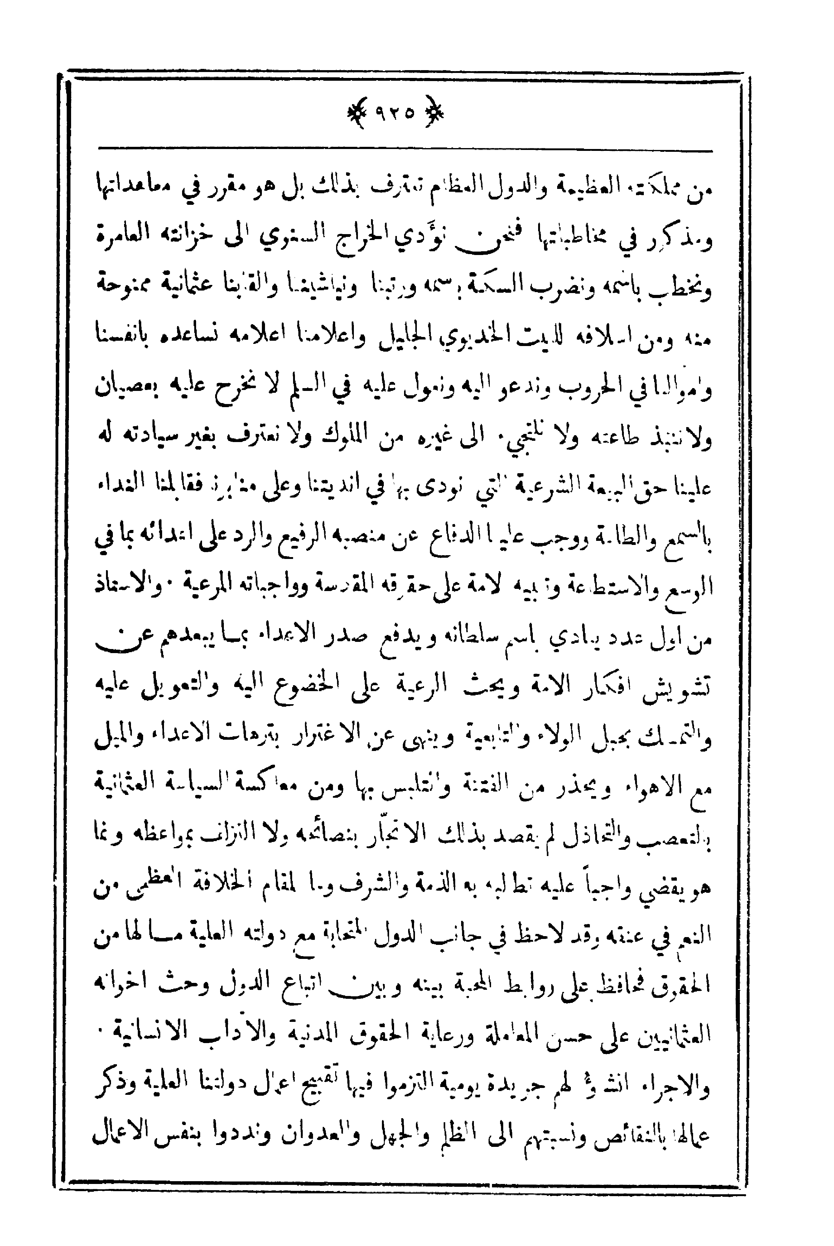 من مملكته العظيمة والدول العظام تعترف بذلك بل هو مقرر في معاهداتها ومذكور في مخاطباتها فنحن نؤدي الخراج السنوي إلى خزانته العامرة ونخطب باسمه ونضرب السكة باسمه ورتبنا ونياشينا والقاينا عثمانية ممنوحة منه ومن أسلافه للبيت الخديوي الجيل وأعلامنا أعلامه نساعده بأنفسنا وأموالنا في الحروب وندعو إليه ونعول عليه في السلم لا نخرج عليه بعصيان ولا ننبذ طاعته ولا نلتجيء إلى غيره من الملوك ولا نعترف بغير سيادته له علينا حق البيعة الشرعية التي نودي بها في أنديتنا وعلى منابرنا فقابلنا الداء بالسمع والطاعة ووجب علينا الدفاع عن منصبه الرفيع والرد على أعدائه بما في الوسع والاستطاعة وتنبيه لأمة على حقوقه المقدسة وواجباته المرعية. والأستاذ من أول عدد ينادي باسم سلطانه ويدفع صدر الأعداء بما يبعدهم عن تشويش أفكار الأمة يحث الرعية على الخضوع إليه والتعويل عليه والتمسك بحبل الولاء والتابعية وينهى عن الاغترار بترهات الأعداء والميل مع الأهواء ويحذر من الفتنة والتلبس بها ومن معاكسة السياسة العثمانية بالتعصب والتخاذل لم يقصد بذلك الاتجار بنصائحه ولا التزلف بمواعظه وإنما هو يقضي واجباً عليه تطالبه بعد الذمة والشرف وما المقام الخلافة العظمى من النعم في عنقه وقد لاحظ في جانب الدول المتحابة مع دولته العلية ما لها من الحقوق فحافظ على روابط المحبة بينه وبين إتباع الدول وحث