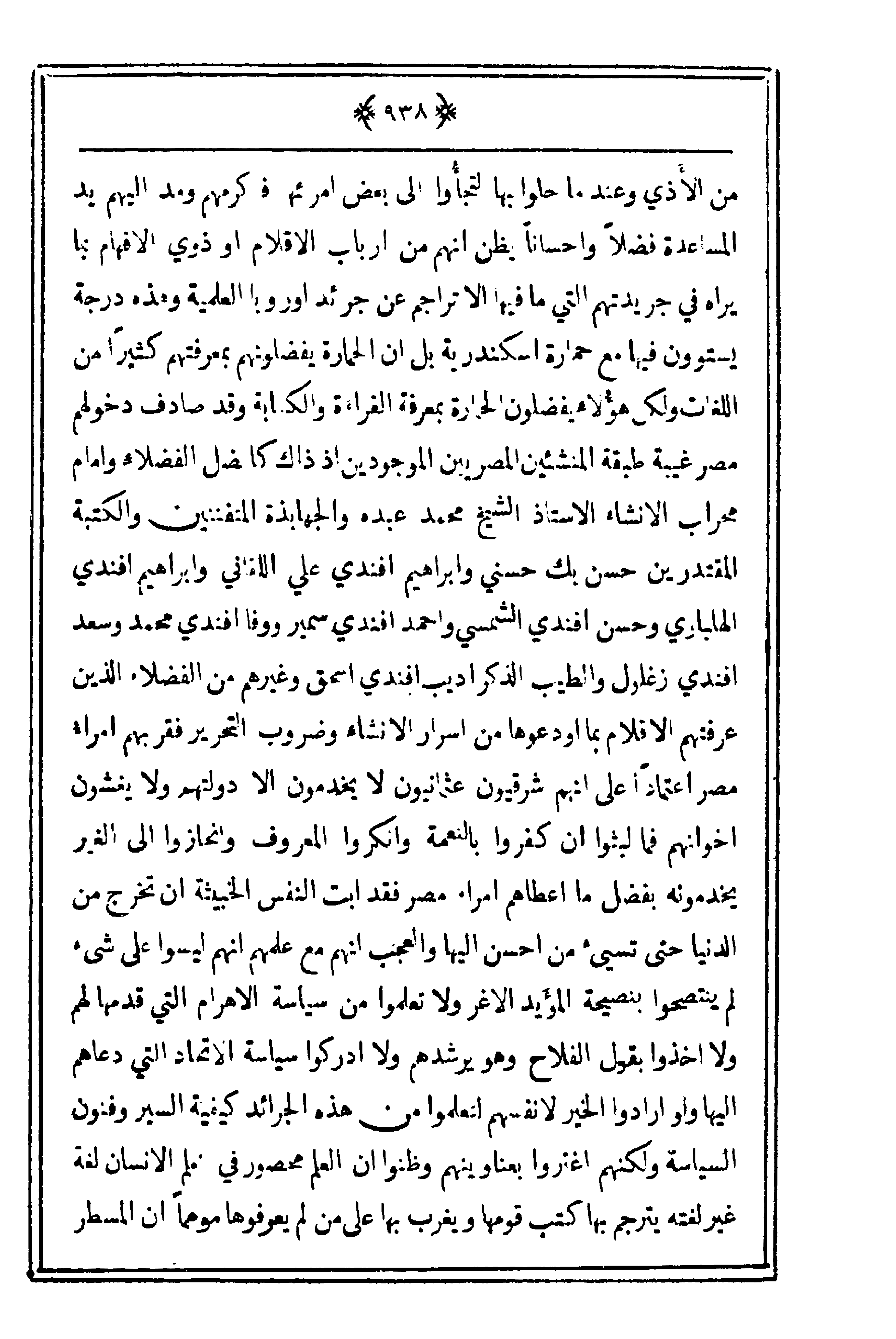 من الأذي وعند ما حلوا بها للتجأُوا إلى بعض أمرائها فأكرمهم ومد إليهم يد المساعدة فضلاً وإحساناً يظن أنهم من أرباب الأقلام أو ذوي الأفهام بما يراه في جريدتهم التي ما فيها إلا تراجم عن جرائد أوروبا العلمية وهذه درجة يستوون فيها مع حمارة إسكندرية بل أن الحمارة يفضلونهم بمعرفتهم كثيراً من اللغات ولكن هؤُلاء يفضلون الحمارة بمعرفة القراءة والكتابة وقد صادف دخولهم مصر غيبة طبقة المنشئين المصريين الموجودين إذ ذاك كأفضل الفضلاء وإمام محراب الإنشاء الأستاذ الشيخ محمد عبده والجهابذة المتفنين والكتبة المقتدرين حسن بك حسني وإبراهيم أفندي علي اللغاني وإبراهيم أفندي الهلباري وحسن أفندي الشمسي وأحمد أفندي سمير ووفا أفندي محمد وسعد أفندي زغلول والطيب الذكر أديب أفندي أسحق وغيرهم من الفضلاء الذين عرفتهم الأقلام بما أودعوها من أسرار الإنشاء وضروب التحرير فقربهم أمراءُ مصر اعتماداً على أنهم شرقيون عثمانيون لا يخدمون إلا دولتهم ولا يغشون أخوانهم فما لبثوا أن كفروا بالنعمة وانكروا المعروف وانحازا إلى الغير يخدمونه بفض لما أعطاهم أمراء مصر فقد أبت النفس الخبيثة أن تخرج من الدنيا حتى تسيء من أحسن إليها والعجب أنهم مع علمهم أنهم ليسوا على شيء لم ينتصحوا بنصيحة المؤيد الأغر ولا تعلموا من سياسة الأهرام التي قدمها لهم ولا أخذوا بقول الفلاح وهو يرشدهم ولا أدركوا سياسة الاتحاد التي دعاهم إليها ولو أرادوا الخير لأنفسهم لتعلموا من هذه الجرائد كيفية السير وفنون السياسة ولكنهم اغتروا بعناوينهم وظنوا أن العلم محصور في تعلم الإنسان لغة غير لغته يترجم بها كتب قومها ويغرب بها على من لم يعرفوها موهماً أن المسطر