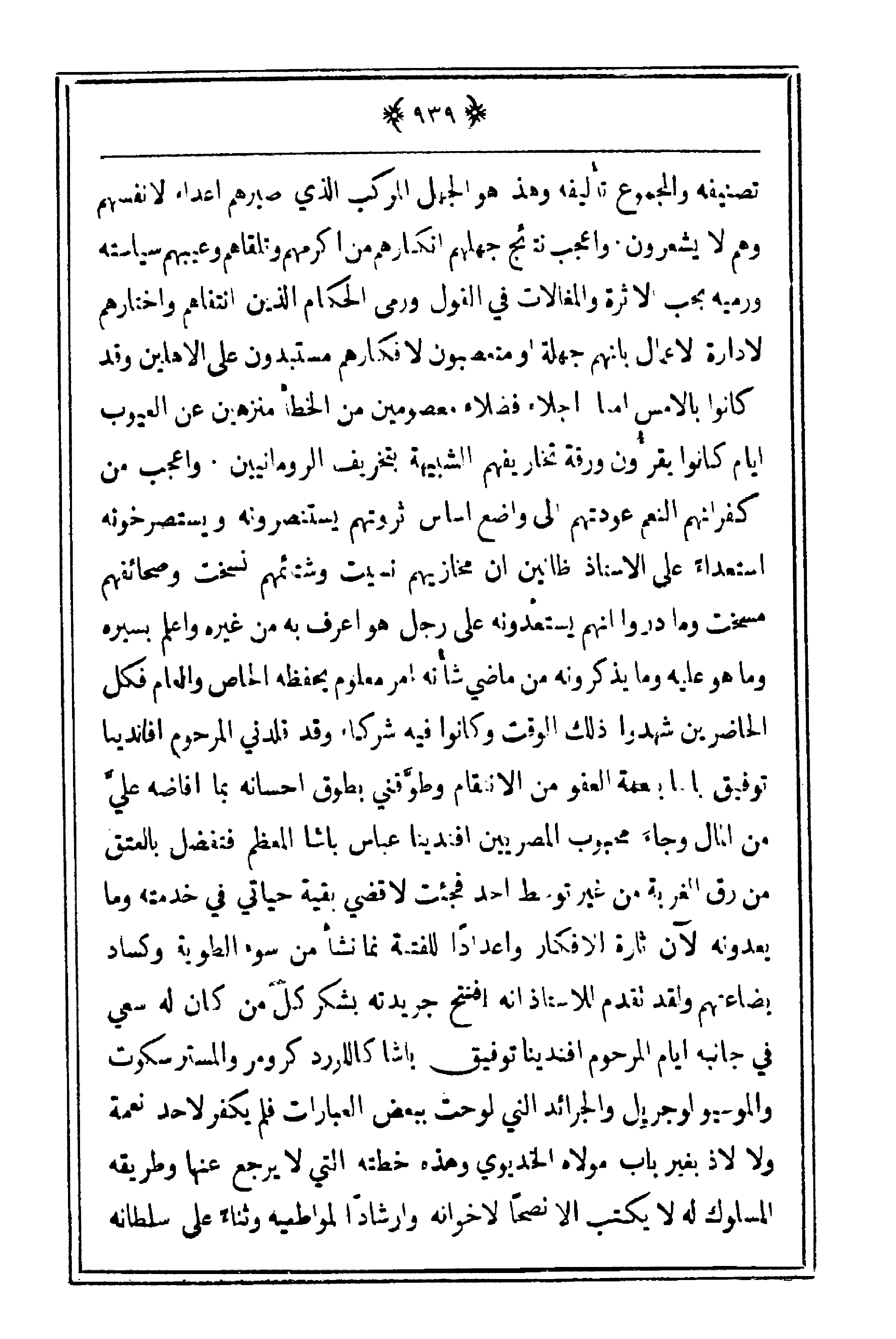 وهم لا يشعرون وأعجب نتائج جهلهم إنكارهم من أكرمهم وتلقاهم وعيبهم سياسته ورميه بحب الأثرة والمغالات في القول ورمى الحكام الذي انتقاهم واختارهم لإدارة لأعمال بأنهم جهلة أو متعصبون لأفكارهم مستبدون على الأهلين وقد كانوا بالأمس أمناء أجلاء فضلاء معصومين من الخطأ منزهين عن العيوب أيام كانوا يقرؤون ورقة تخاريفهم الشبيهة بتخريف الرومانيين. وأعجب من كفرانهم النعم عودتهم إلى واضع أساس ثروتهم يستنصرونه ويستصرخونه استعداءً على الأستاذ ظانين أن مخازيهم نسيت وشتأمهم نسخت وصحائفهم مسخت وما دروا أنهم يستعدونه على رجل هو أعرف به من غيره وأعلم بسيره وما هو عليه وما يذكرونه من ماضي شأنه أمر معلوم يحفظه الخاص والعام فكل الحاضرين شهدوا ذلك الوقت وكانوا فيه شركاء وقد قلدني المرحوم أفنادينا توفيق بابا بنعمة العفو من الانتقام وطوّقني بطوق إحسانه بما أفاضه عليّ من المال وجاء محبوب المصريين أفندينا عباس باشا المعظم فتفضل بالعتق من رق الغربة من غير توسط أحد فجئت لأقضي بقية حياتي في خدمته وما يعدونه لآن إثارة للأفكار وإعداداً للفتنة نما نشأ من سوء الطوية وكساد بضاعتهم ولقد تقدم للأستاذ أنه أفتتح جريدته بشكر كل من كان له سعي في جانبه أيام المرحوم أفندينا توفيق باشا كاللورد كرومر والمسترسكوت والموسيولوجريل والجرائد التي لوحت ببعض العبارات فلم يكفر لأحد نعمة ولا لاذ بغير باب مولاه الخديوي وهذه خطته التي لا يرجع عنها وطريقه المسلوك له لا يكتب إلا نصحاً لإخوانه وإرشادا لمواطنيه وثناءً على سلطانه