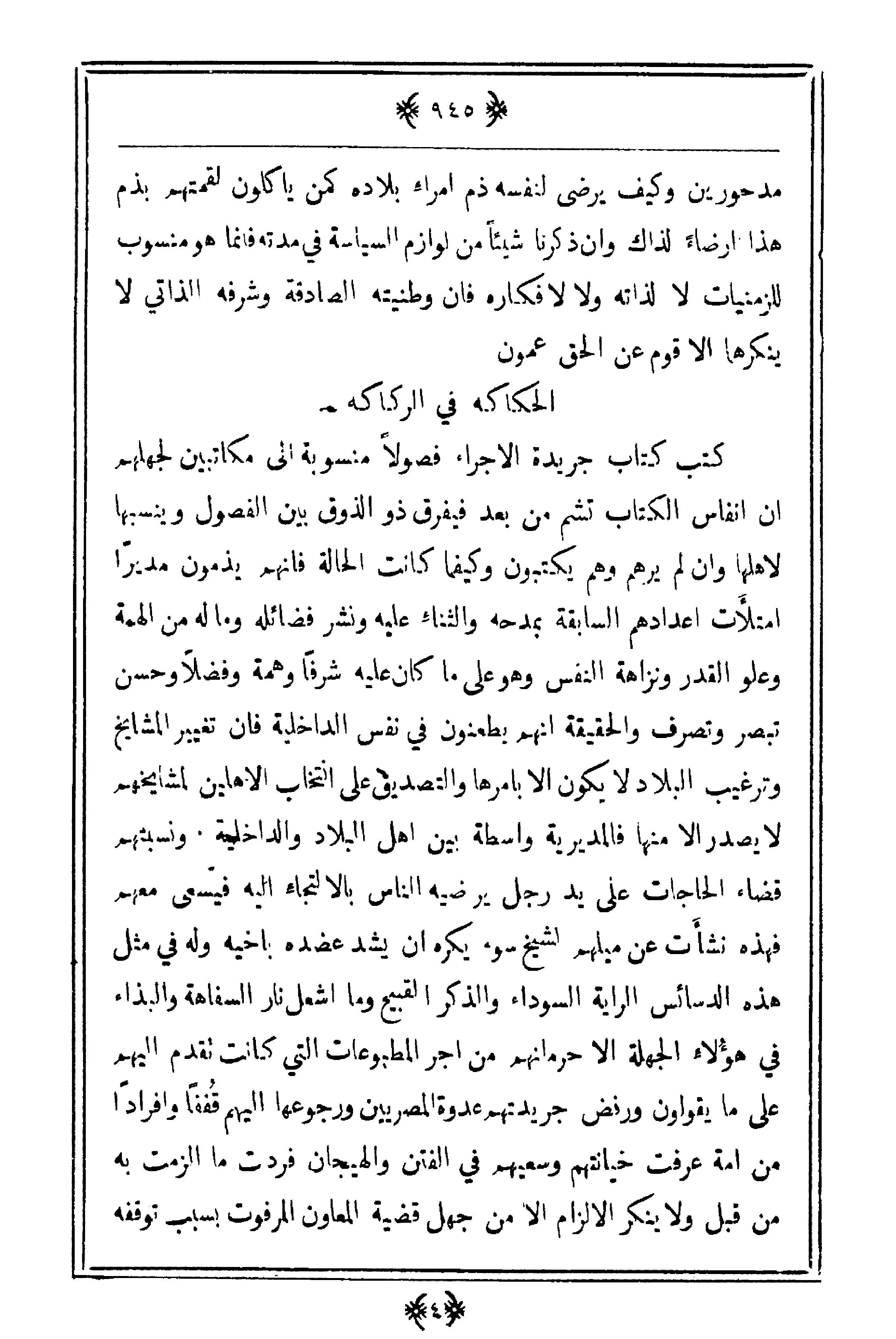 مدحورين وكيف يرضى لنفسه ذم أمراءٍ بلاده كم يأكلون لقمتهم بذم هذا أرضاء لذاك وأن ذكرنا شيئاً من لوازم السياسة في مدته فإنما هو منسوب للزمنيات لا لذاته ولا لأفكاره فإن وطنيته الصادقة وشرفه الذاتي لا ينكرهما إلا قوم عن الحق عمون.