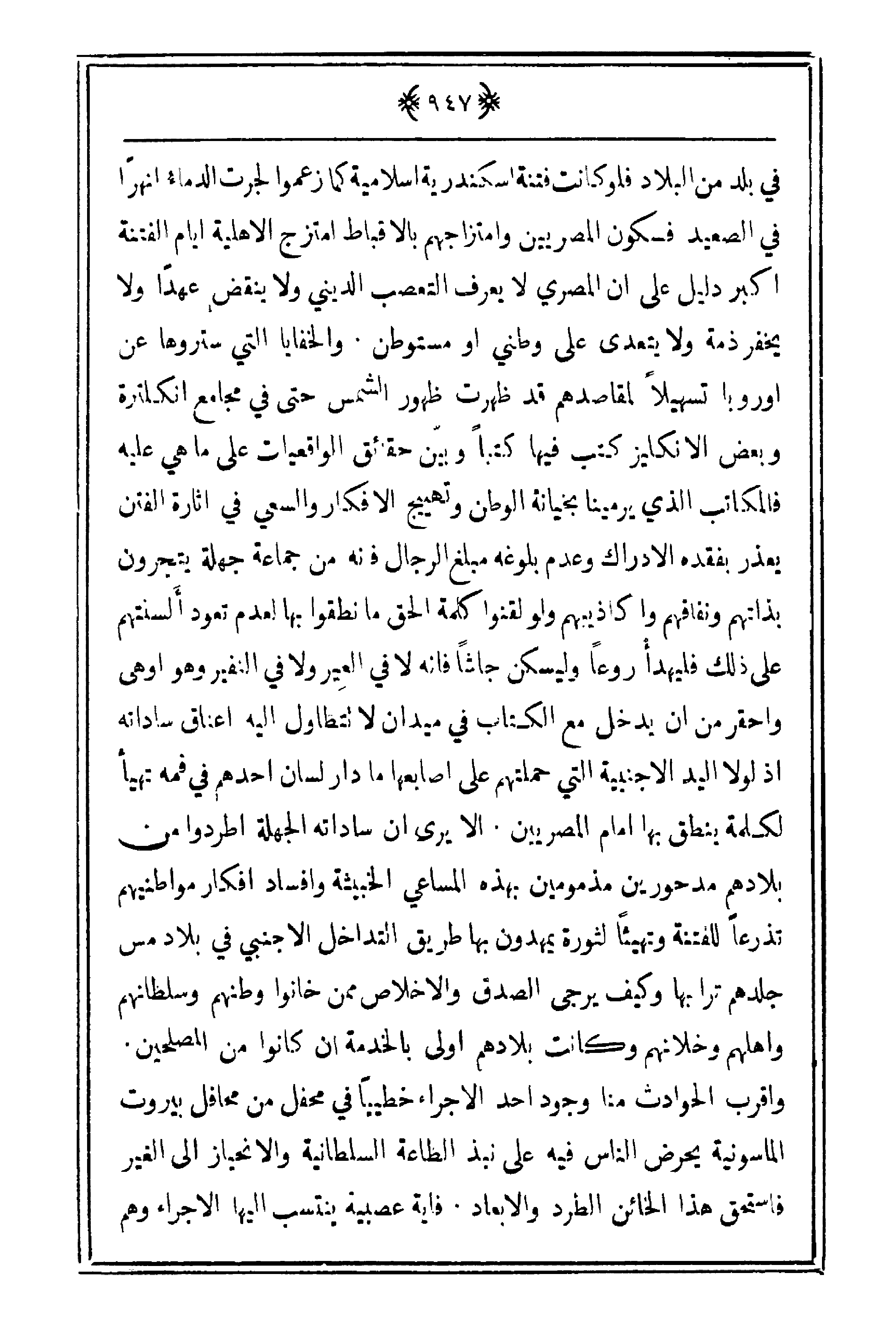 في بلد من البلاد فلو كانت فتنة اسكندرية إسلامية كما زعموا لجرت الدماءُ أنهراً في الصعيد فسكون المصريين وامتزاجهم بالأقباط امتزج الأهلية أيام الفتنة أكبر دليل على أن المصري لا يعرف التعصب الديني ولا ينقض عهداً ولا يخفر ذمة ولا يتعدى على وطني أو مستوطن. والخفايا التي ستروها عن أوروبا تسهيلاً لمقاصدهم قد ظهرت ظهور الشمس حتى في مجامع انكلترة وبعض الإنكليز كتب فيها كتباً وبين حقائق الواقعيات على ما هي عليه فالمكاتب الذي يرمينا بخيان الوطن وتهيج الأكفار والسعي في إثارة الفتن يعذر بفقده الإدراك وعدم بلوغه مبلغ الرجال فإنه من جماعة جهلة يتجرون بذاتهم ونفاقهم وأكاذيبهم ولو لقنوا كلمة الحق ما نطقوا بها لعدم تعود ألسنتهم على ذلك فليهدأ روعاً وليسكن جاشاً فإنه لا في العير ولا في النفير وهو أوهي وأحقر من أن يدخل مع الكتاب في ميدان لا تتطاول إليه أعناق ساداته إذ لولا اليد الأجنبية التي حملتهم على أصابعها ما دار لسان أحدهم في فمه تهيأ لكلمة ينطق بها أمام المصريين. إلا يرى أن ساداته الجهلة اطردوا من بلادهم مدحورين مذمومين بهذه المساعي الخبيثة وإفساد أفكار مواطنيهم تذرعاً للفتنة وتهيئاً لثورة يمهدون بها طريق التداخل الأجنبي في بلاد مس جلدهم ترابها وكيف يرجى الصدق والإخلاص ممن خانوا وطنهم وسلطانهم وأهلهم وخلانهم وكانت بلادهم أولى بالخدمة أن كانوا من المصلحين. وأقرب الحوادث منا وجود أحد الأجراء خطيياً في محفل من محافل بيروت الماسونية يحرض الناس فيه على نبذ الطاعة السلطانية والإنجاز إلى الغير فاستحق هذا الخائن الطرد والإبعاد. فأية عصبية ينتسب إليها الإجراء وهم