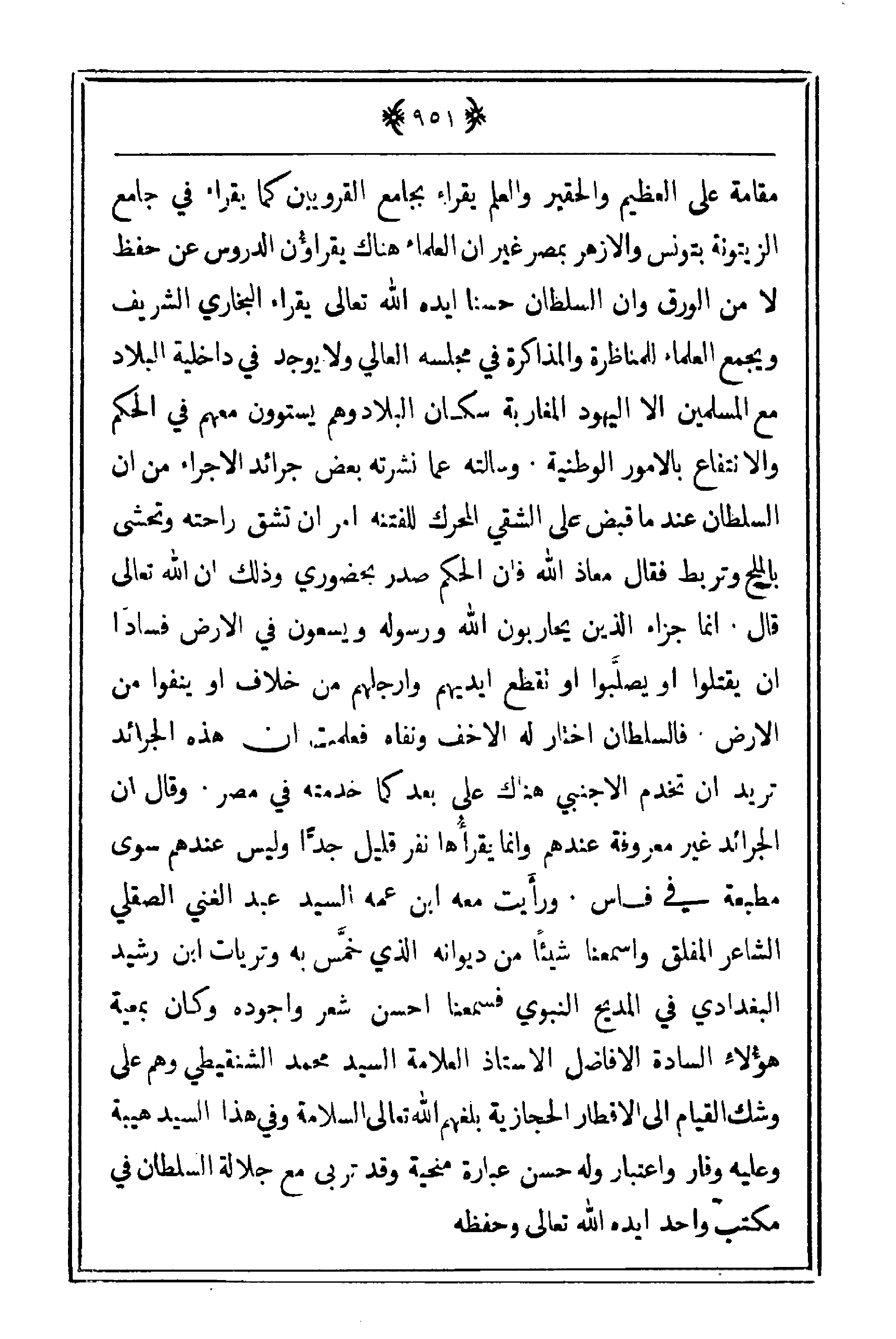 مقامة على العظم والحقير والعلم يقرأ بجامع القرويين كما يقرأ في جامع الزيتونة بتونس والأزهر بمصر غير أن العلماء هناك يقرأون الدروس عن حفظ لا من الورق وإن السلطان حسنا أيده الله تعالى يقرأ البخاري الشريف ويجمع العلماء للمناظرة والمذاكرة في مجلسه العالي ولا يوجد في داخلية البلاد مع المسلمين إلا اليهود المغاربة سكان البلاد وهم يستوون معهم في الحكم والانتفاع بالأمور الوطنية. وسألته عما نشرته بعض جرائد الإجراء من أن السلطان عند ما قبض على الشقي المحرك للفتنه أمر أن تشق راحته وتحشى بالمليح وتربط فقال معاذ الله فإن الحك صدر بحضوري وذلك أن الله تعالى قال. إنما جزاء الذين يحاربون الله ورسوله ويسعون في الأرض فساداً أن يقتلوا أو يصلبوا أو تقطع أيديهم وأرجلهم من خلاف أو ينفوا من الأرض فالسلطان اختار له الأخف ونفاه فعلمت أن هذه الجرائد تريد أن تخدم الأجنبي هناك على بعد كما خدمته في مصر. وقال أن الجرائد غير معروفة عندهم وإنما يقرأُها نفر قليل جدّاً وليس عندهم سوى مطبعة في فاس. ورأيت معه ابن عمه السيد عبد الغني الصقلي الشاعر المفلق وأسمعنا شيئاً من ديوانه الذي