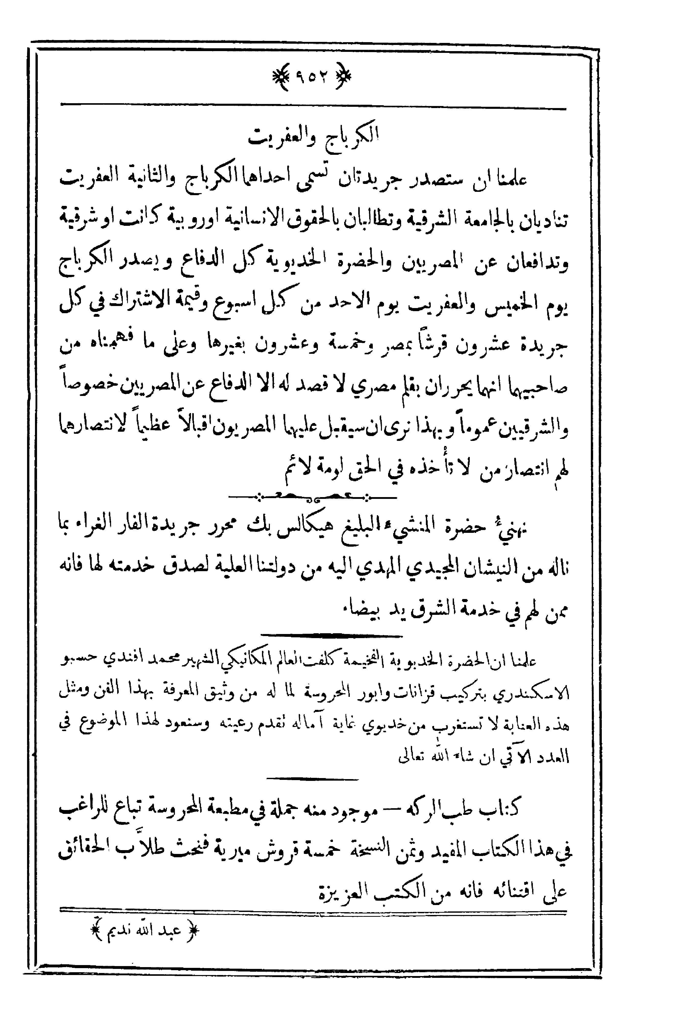 علمنا أن ستصدر جريدتان تسمى أحداهما الكرباج والثانية العفريت تناديان بالجامعة الشرقية وتطالبان بالحقوق الإنسانية أوروبية كانت أو شرقية وتدافعان عن المصريين والحضرة الخديوية كل الدفاع ويصدر الكرباج يوم الخميس والعفريت يوم الأحد منكل أسبوع وقيمة الاشتراك في كل جريدة عشرون قرشاً بمصر وخمسة وعشرون بغيرها وعلى ما فهمناه من صاحبيهما أنهما يحرران بقلم مصري لا قصد له إلا الدفاع عن المصريين خصوصاً والشرقيين عموماً وبهذا نرى أن سيقبل عليهما المصريون إقبالاً عظيماً لانتصارهما لهم انتصار من لا تأخذه في الحق لومة لائم.