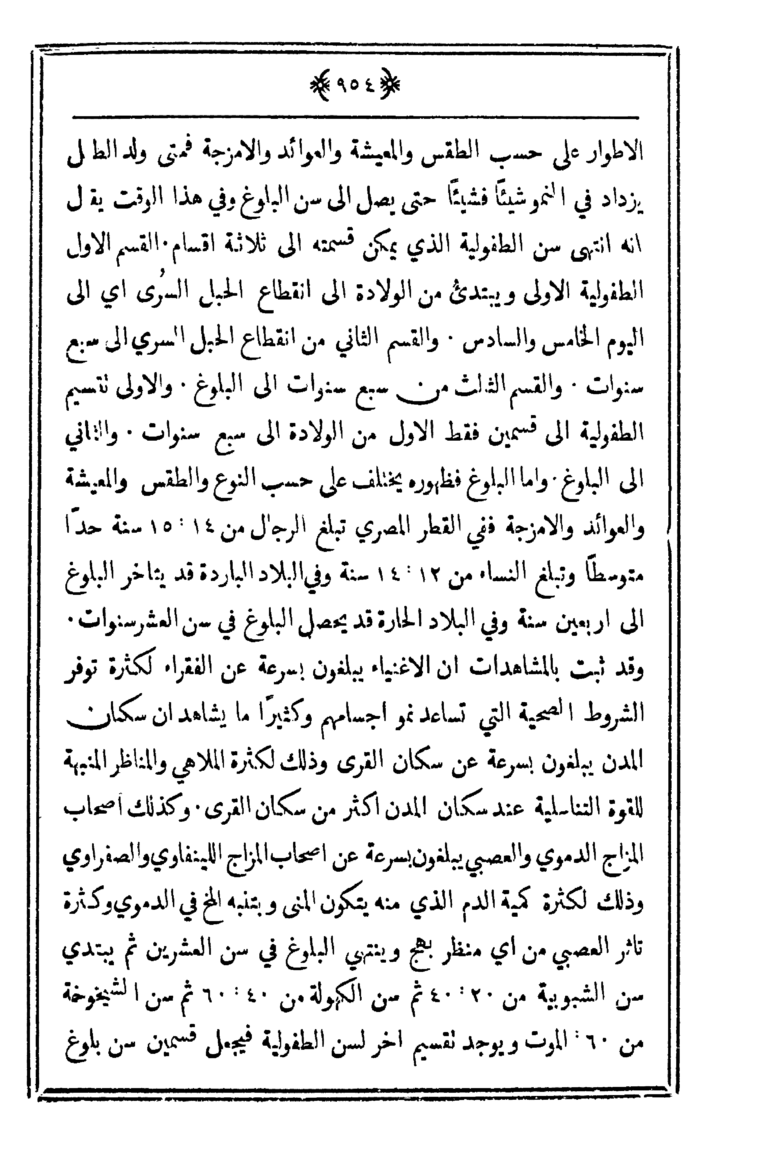 الأطوار على حسب الطقس والمعيشة والعوائد والأمزجة فمتى ولد الطفل يزداد في النمو شيئاً فشيئاً حتى يصل إلى سن البلوغ وفي هذا الوقت يقال أنه انتهى سن الطفولية الذي يمكن قسمته إلى ثلاث أقسام. القسم الأول الطفولية الأولى ويبتدئُ من الولادة إلى انقطاع الحبل السري أي على اليوم الخامس والسادس. والقسم الثاني من انقطاع الحبل السري إلى سبع سنوات. والقسم الثالث من سبع سنوات إلى البلوغ. والأولى تقسيم الطفولية إلى قسمين فقط الأول من الولادة إلى سبع سنوات. والثاني إلى البلوغ وأما البلوغ فظهوره يختلف على حسب النوع والطقس والمعيشة والعوائد والأمزجة ففي القطر المصري تبلغ الرجال من 14 - 15 سنة حداً متوسطاً وتبلغ النساء من 12 - 14 سنة وفي البلاد الباردة قد يتأخر البلوغ إلى أربعين سنة وفي البلاد الحارة قد يحصل البلوغ في سن العشر سنوات. وقد ثبت بالمشاهدات أن الأغنياء يبلغون بسرعة عن الفقراء لكثرة توفر الشروط الصحية التي تساعد نمو أجسامهم وكثيراً ما يشاهد أن سكان المدن يبلغون بسرعة عن سكان القرى وذلك لكثرة الملاهي والمناظر المنبهة للقوة التناسلية عند سكان المدن أكثر من سكان القرى. وكذلك أصحاب المزاج الدموي والعصبي يبلغون بسرعة عن أصحاب المزاج الليمفاوي والصفراوي وذلك لكثرة كمية الدم الذي منه يتكون المنى وبتنبه المخ في الدموي وكثرة تأثر العصبي من أي منظر بهج وينتهي البلوغ في سن العشرين ثم