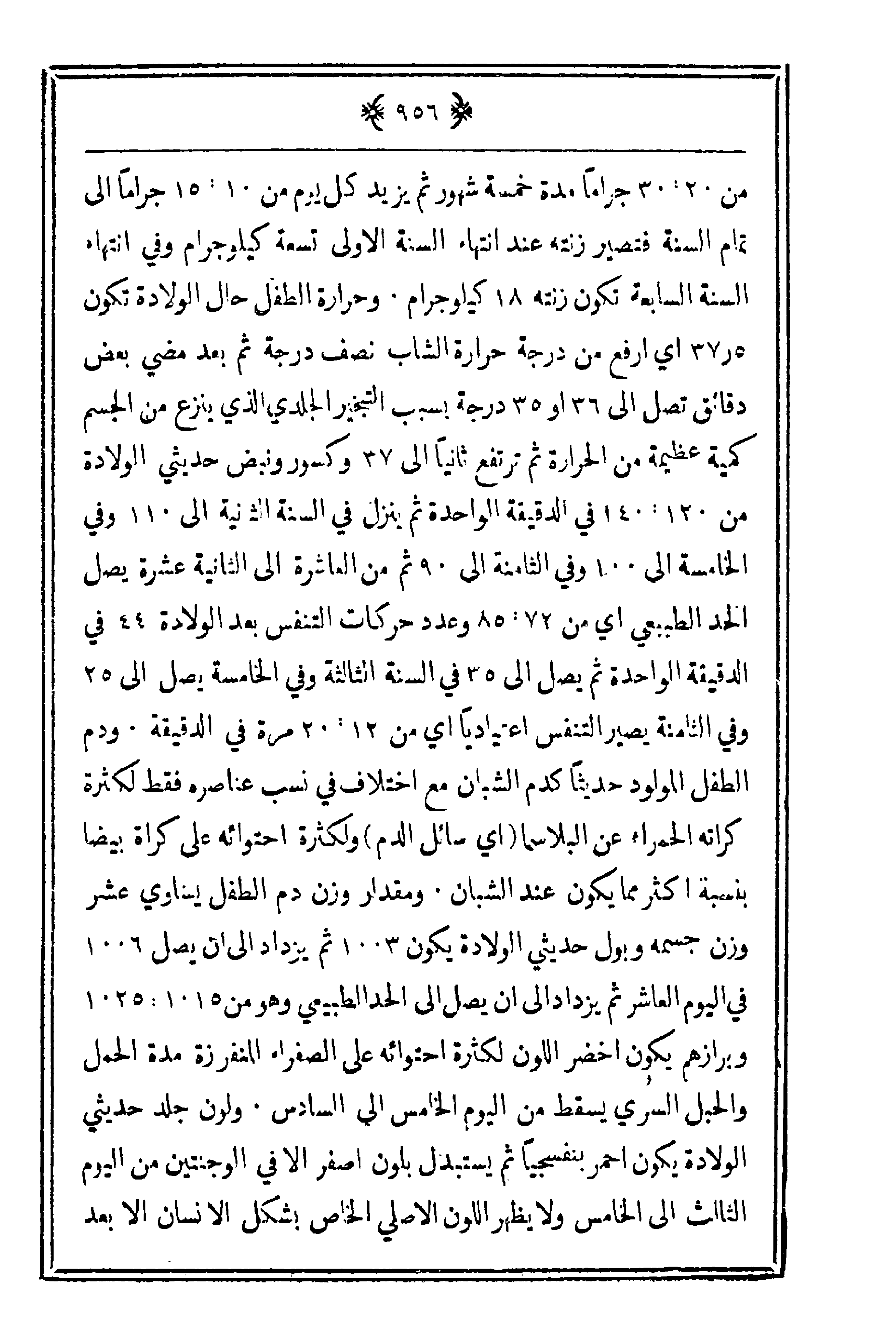 من 20 - 30 جراماً مدة خمسة شهور ثم يزيد كل يوم من 10 - 15 جراماً إلى تمام السنة فتصير زنته عند انتهاء السنة الأولى تسعة كيلوجرام وفي انتهاء السنة السابعة تكون زنته 18 كيلوجرام. وحرارة الطفل حال الولادة تكون 37. 5 أي ارفع من درجة حرارة الشاب نصف درجة ثم بعد مضي بعض دقائق تصل إلى 36 أو 35 درجة بسبب التبخير الجلدي الذي ينزع من