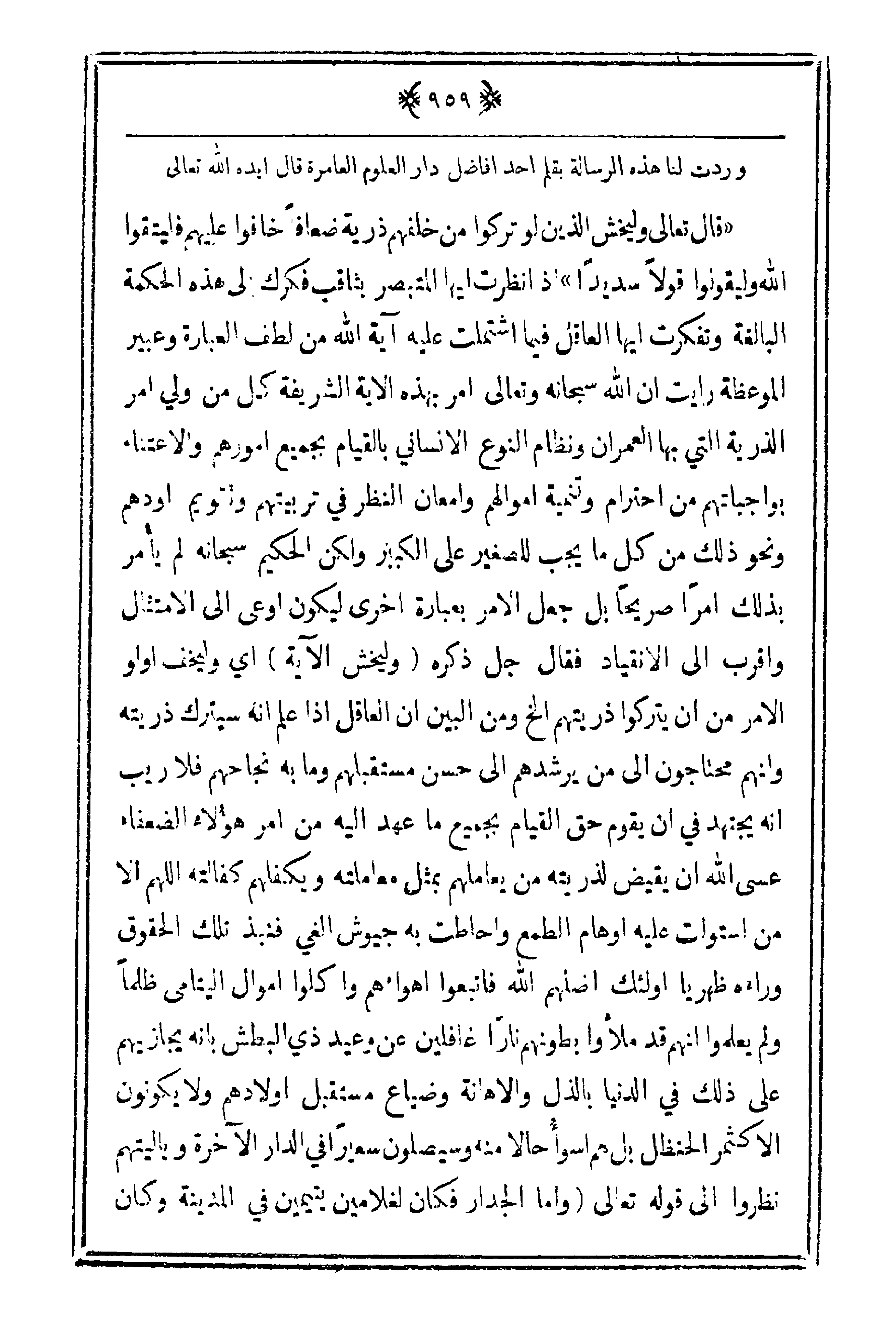 قال تعالى {وليخش الذين لو تركوا من خلفهم أذية ضعافاً خافوا عليهم فليتقوا الله وليقولوا قولاً سديداً} إذا نظرت إليها المتبصر بثاقب فكرك إلى هذه الحكمة البالغة وتفكرت أيها العاقل فيما اشتملت عليه آية الله من لطف العبارة وعبير الموعظة رأيت أن الله سبحانه وتعالى أمر بهذه الآية الشريفة كل من ولي أمر الذرية التي بها العمران ونظام النوع الإنساني بالقيام بجميع أمورهم والاعتناء بواجباتهم من احترام وتنمية أموالهم وأمعان النظر في تربيتهم وتقويم أودهم ونحو ذلك م لك ما يجب للصغير على الكبير ولكن الحكيم سبحانه لم يأمر بذلك أمراً صريحاً بل جعل الأمر بعبارة أخرى ليكون أوعى إلى الامتثال وأقرب إلى الانقياد فقال جل ذكره (وليخش الآية) أي وليخف أولو الأمر من أن يتركوا ذريتهم الخ ومن البين أن العاقل إذا علم أنه سيترك ذريته وأنهم محتاجون إلى من يرشدهم إلى حسن مستقبلهم وما به نجاحهم فلا ريب أنه يجتهد في أن يقوم حق القايم بجميع ما عهد إليه من أمر هؤلاء الضعفاء عسى الله أن يقيض لذريته من يعاملهم بمثل معاملته ويكفلهم كفالته اللهم إلا من استولت عليه أوهام الطمع وأحاطت به جيوش الغي فنبذ تلك الحقوق وراءه ظهرياً أولئك أضلهم الله فاتبعوا أهواءهم وأكلوا أموال اليتامى ظلماً ولم يعلموا أنهم قد ملأوا بطونهم ناراً غافلين عن وعيد ذي البطش بأنه يجازيهم على ذلك في الدنيا بالذل والإهانة وضياع مستقبل أولادهم ولا يكونون الأكثر الحنظل بل هم أسوأ حالا منه وسيصلون سعيراً في الدار الآخرة وياليتهم نظروا إلى قوله تعالى {وأما الجدار فكان لغلامين يتيمين في المدينة وكان