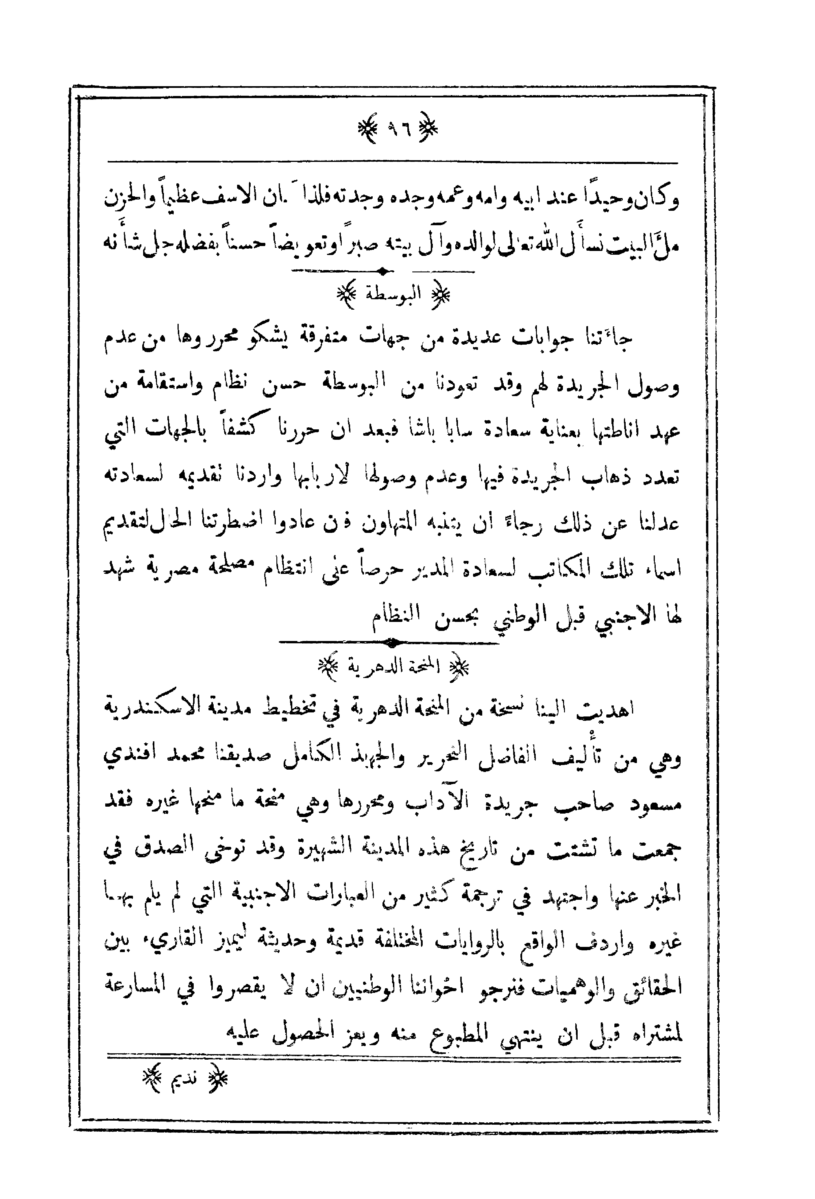 جاءتنا جوابات عديدة من جهات متفرقة يشكو محررها من عدم وصول الجريدة لهم وقد تعونا من البوسطة حسن نظام واستقامة من عهد إناطتها بعناية سعادة سابا باشا فبعد أن حررنا كشفاً بالجهات التي تعدد ذهاب الجريدة فيها وعدم وصولها لأربابها وأردنا تقديمه لسعادته عدلنا عن ذلك رجاءً أن ينتبه المتهاون فإن عادوا اضطرتنا الحال لتقديم أسماء تلك المكاتب لسعادة المدير حرصاً على انتظام مصلحة مصرية شهد لها الأجنبي قبل الوطني بحسن النظام.