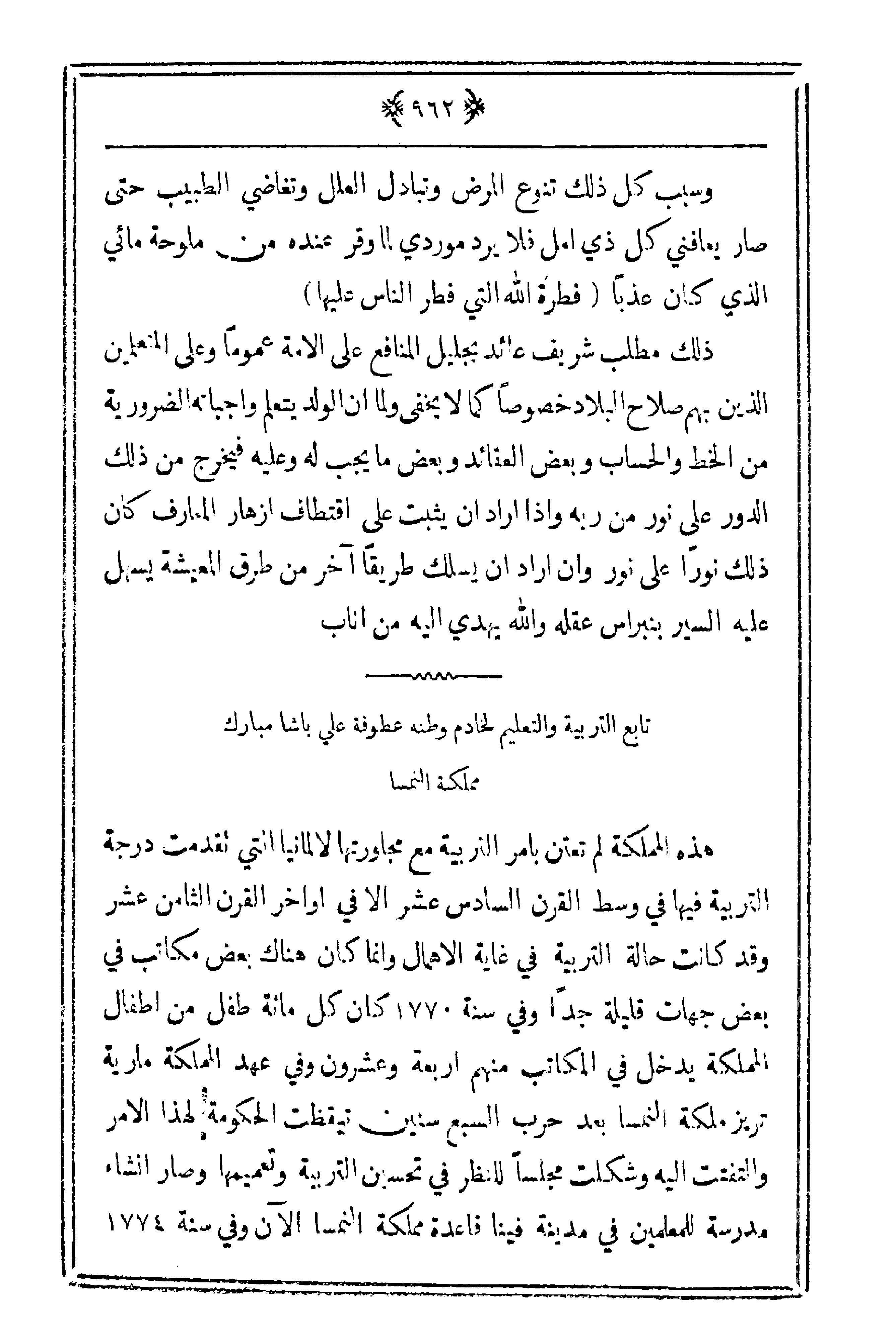 ذلك مطلب شريف عائد بجليل المنافع على الأمة عموماً وعلى المتعلمين الذين بهم صلاح البلاد خصوصاً كما لا يخفى ولما أن الولد يتعلم واجباته الضرورية من الخط والحساب وبعض العقائد وبعض ما يجب له وعليه فيخرج من ذلك الدور على نور من ربه وإذا أراد أن يثبت على اقتطاف أزهار المعارف كان ذلك نوراً على نور وأن أراد أن يسلك طريقاً آخر من طرق المعيشة يسهل عليه السير بنبراس عقله والله يهدي إليه من أناب.