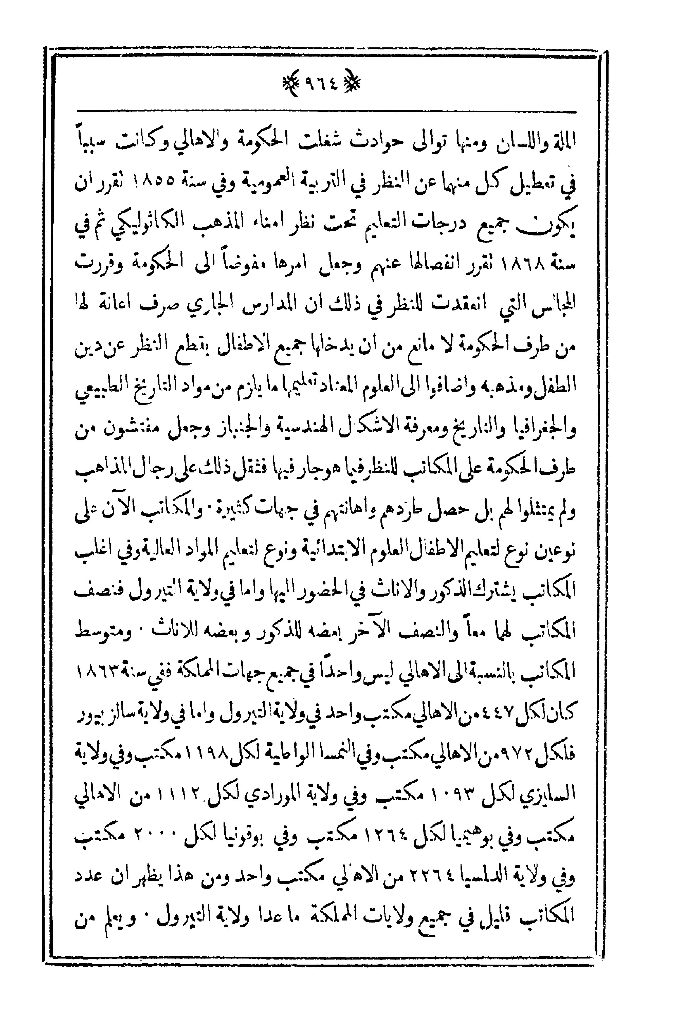 الملة واللسان ومنها توالى حوادث شغلت الحكومة والأهالي وكانت سبباً في تعطيل كل منهما عن النظر في التربية العمومية وفي سنة 1855 تقرر أن يكون جميع درجات التعليم تحت نظر أمناء المذهب الكاثوليكي ثم أن سنة 1868 تقرر انفصالها عنهم وجعل أمرها مفوضاً إلى الحكومة وقررت المجالس التي انعقدت للنظر في ذلك أن المدارس الجاري صرف إعانة لها من طرف الحكومة لا مانع من أن يدخلها جميع الأطفال بقطع النظر عن دين الطفل ومذهبه وأضافوا إلى العلوم المعتاد تعليمها ما يلزم من مواد التاريخ الطبيعي والجغرافيا والتاريخ ومعرفة الأشكال الهندسية والجنباز وجعل مفتشون من طرف الحكومة على المكاتب للنظر فيما هو جار فيها فثقل ذلك على رجال المذاهب ولم يمتثلوا لهم بل حصل طردهم وإهانتهم في جهات كثيرة والمكاتب الآن على نوعين نوع لتعليم الأطفال العلوم الابتدائية ونوع لتعليم المواد العالية وفي أغلب المكاتب يشترك الذكور والإناث في الحضور إلهيا وأما في ولاية التيرول فنصف المكاتب لهما معاً والنصف الآخر بعضه للذكور وبعضه للإناث. ومتوسط المكاتب بالنسبة إلى الأهالي ليس واحداً في جميع جهات المملكة ففي سنة 1863 كان لكل 447 من الأهالي مكتب واحد في ولاية التيرول وأما في ولاية سالزبيور فلكل 972 من الأهالي وفي النمسا الواطية لكل 1198 مكتب وفي ولاية السليزي لكل 1093 مكتب وفي ولاية المورادي لكل 1112 من الأهالي مكتب وفي بوهيميا لكل 1264 مكتب وفي بوقونيا لكل 2000 مكتب وفي ولاية الدلمسيا 2264 م الأهالي مكتب واحد ومن هذا يظهر أن عدد المكاتب قليل في جميع ولايات المملكة ما عدا ولاية التيرول. ويعلم من