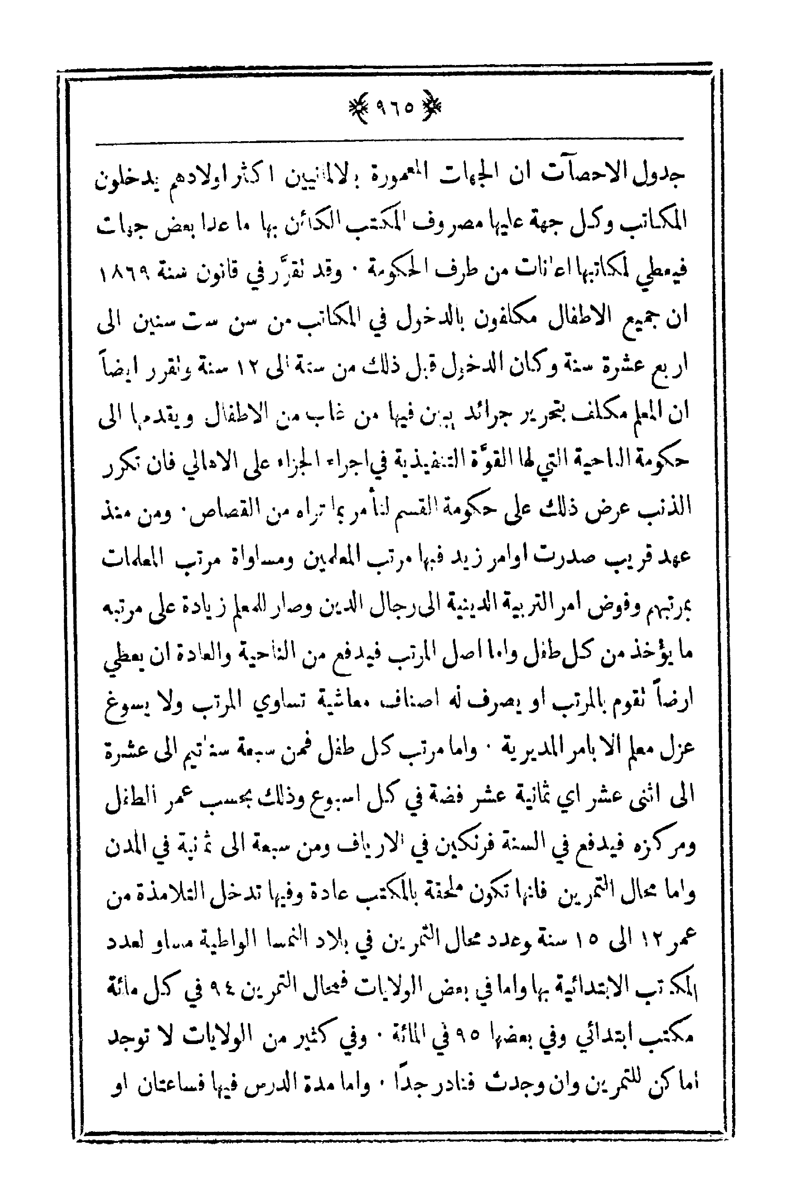 جدول الإحصاءات إن الجهات المعمورة بالألماني أكثر أولادهم يدخلون المكاتب وكل جهة عليها مصروف المكتب الكائن بها ما عدا بعض جهات فيعطي لمكاتبها إعانات من طرف الحكومة. وقد تقرّر في قانون سنة 1869 إن جميع الأطفال مكلفون بالدخول في المكاتب من سن ست سنين إلى أربع عشرة سنة وكان الدخول قبل ذلك من سنة إلى 12 سنة وتقرر أيضاً أن المعلم مكلف بتحرير جرائد يبين فيها من غاب من الأطفال ويقدمها إلى حكومة الناحية التي لها القوّة التنفيذية في إجراء الجزاء على الأهالي فإن تكرر الذنب عرض ذلك على