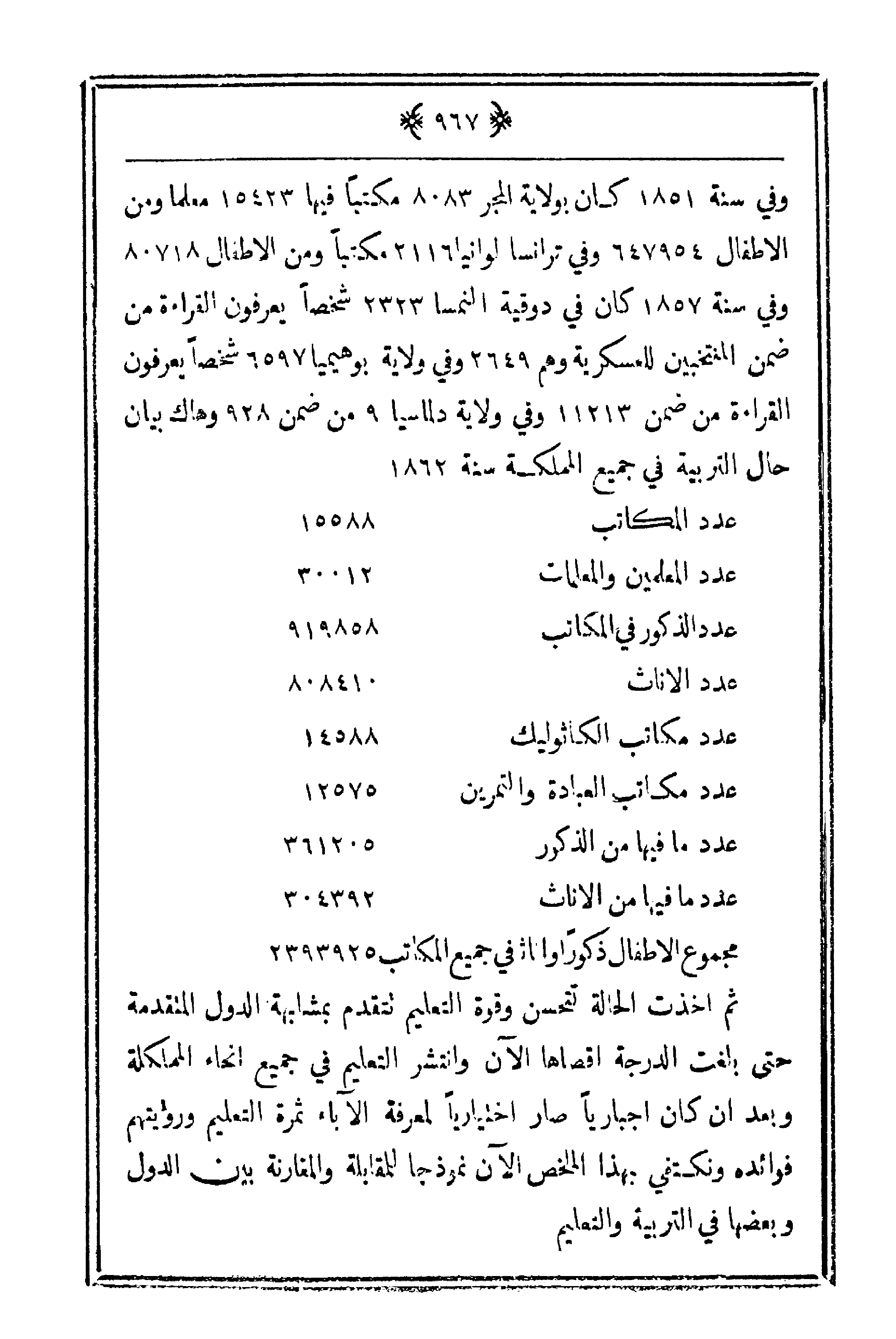 وفي سنة 1851 كان بولاية المجر 8083 مكتباً فيها 15423 معلماً ومن الأطفال 647954 وفي ترانسا لوانيا 2116 مكتباً ومن الأطفال 80718 وفي سنة 1857 كان في دوقية النمسا 2323 شخصا يعرفون القراءة من ضمن المنتخبين للعسكرية وهم 2649 وفي ولاية بوهيميا 6597 شخصاً يعرفون القراءة من ضمن 11213 وفي ولاية دلماسيا 9 من ضمن 928 وهاك بيان حال التربية في جميع المملكة سنة 1862.