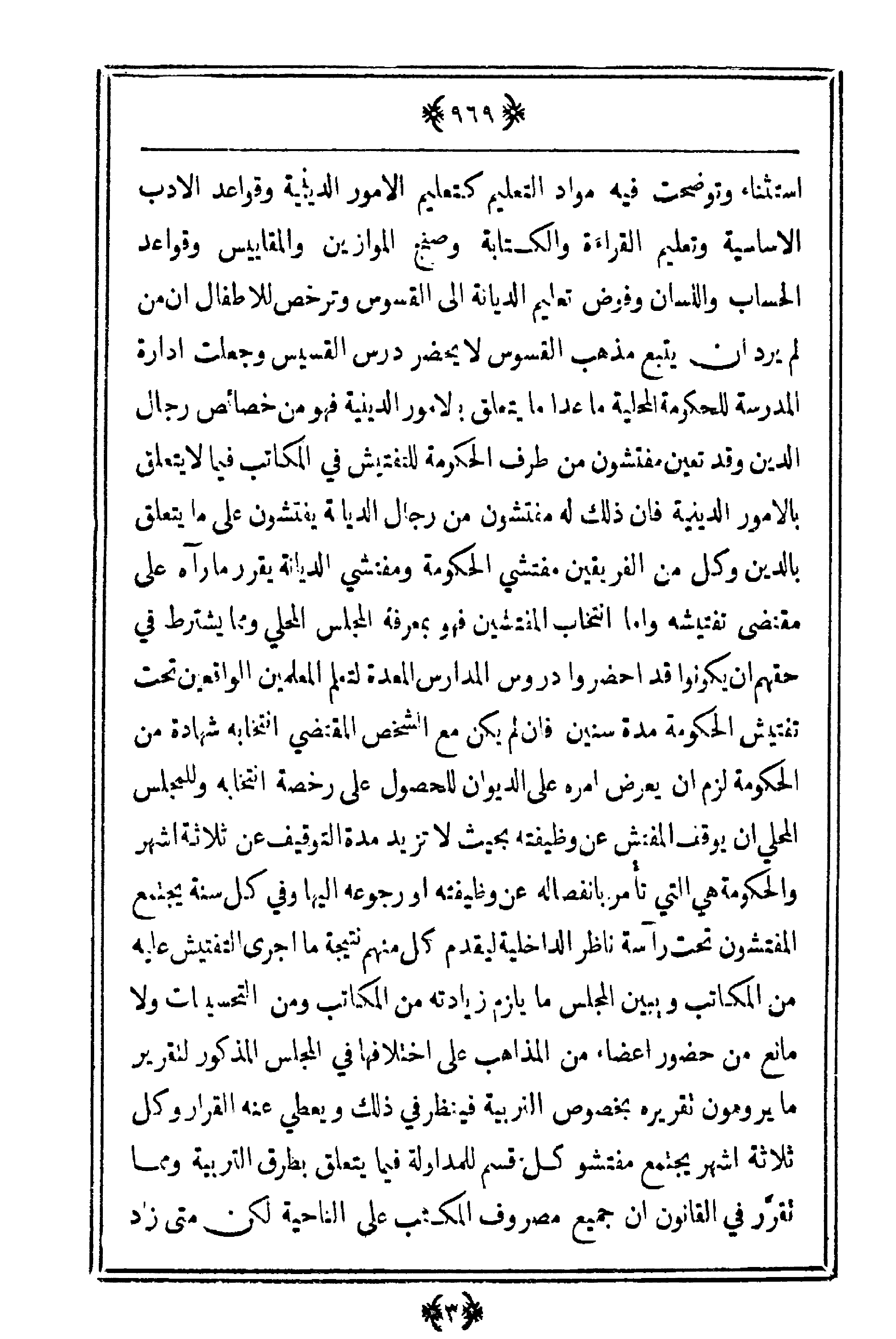 استثناء وتوضحت فيه مواد التعليم كتعليم الأمور الدينية وقواعد الأدب الأساسية وتعليم القراءة والكتابة و؟؟ الموازين والمقاييس وقواعد الحساب واللسان وفوض تعليم الديانة إلى القسوس وترخص للأطفال أن من لم يرد أن يتبع مذهب القسوس لا يحضر درس القسيس وجعلت إدارة المدرسة للحكومة المحلية ما عدا ما يتعلق بالأمور الدينية فهو من خصائص رجال الدين وقد تعين مفتشون من طرف الحكومة للتفتيش في المكاتب فيما لا يتعلق بالأمور الدينية فإن ذلك له مفتشون من رجال الديانة يفتشون على ما يتعلق بالدين وكل من الفريقين مفتشي الحكومة ومفتشي الديانة يقرر ما رآه على مقتضى تفتيشه وأما انتخاب المفتشي فهو بمعرفة المجلس المحلي ومما يشترط في حقهم أن يكونوا قد احضروا دروس المدارس المعدة لتعلم المعلمين الواقعون تحت تفتيش الحكومة مدة سنين فإن لم يكن مع الشخص المقتضي انتخابه شهادة من الحكومة لزم أن يعرض أمره على الديوان للحصول على رخصة انتخابه وللمجلس المحلي أن يوقف المفتش عن وظيفته بحيث لا تزيد مدة التوقيف عن ثلاثة أشهر والحكومة هي التي تأمر بانفصاله ع وظيفته أو رجوعه إليها وفي كل سنة