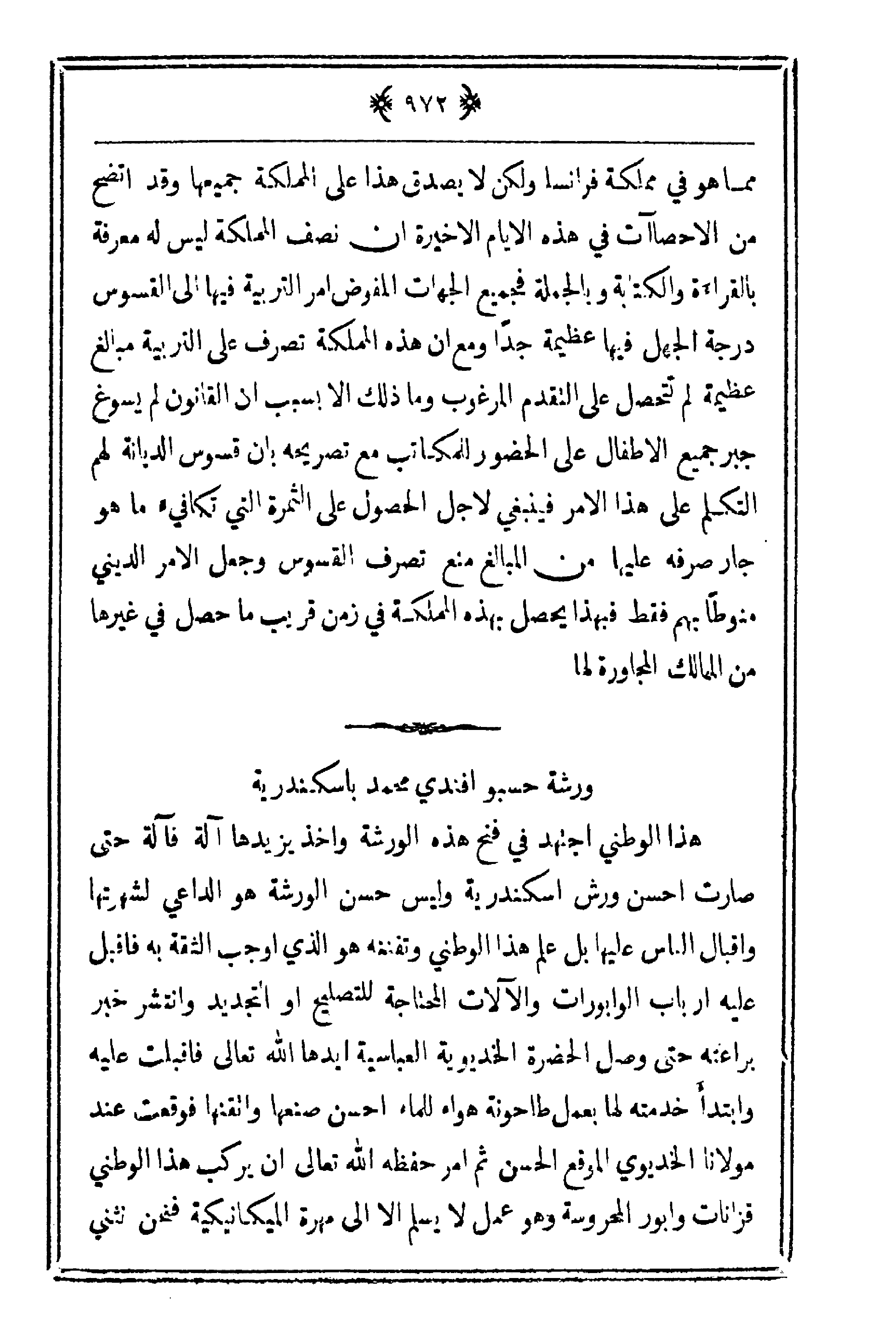 هذا الوطني اجتهد في فتح هذه الورشة وأخذ يزيدها آلة فآلة حتى صارت أحسن ورش اسكندرية وليس حسن الورشة هو الداعي لشهرتها وإقبال الناس عليها بل علم هذا الوطني وتفننه هو الذي أوجب الثقة به فأقبل عليه أرباب البابورات والآلات المحتاجة للتصليح أو التجديد وانتشر خبر براعته حتى وصل الحضرة الخديوية العباسية أيدها الله تعالى فأقبلت عليه وابتدأ خدمته لها بعمل طاحونة هواء للماء أحسن صنعها وأتقنها فوقعت عند مولانا الخديوي الموقع الحسن ثم أمر حفظه الله تعالى أن يركب هذا الوطني قزانات وأبور المحروسة وهو عمل لا يسلم إلا إلى مهرة الميكانيكية فنحن نثني