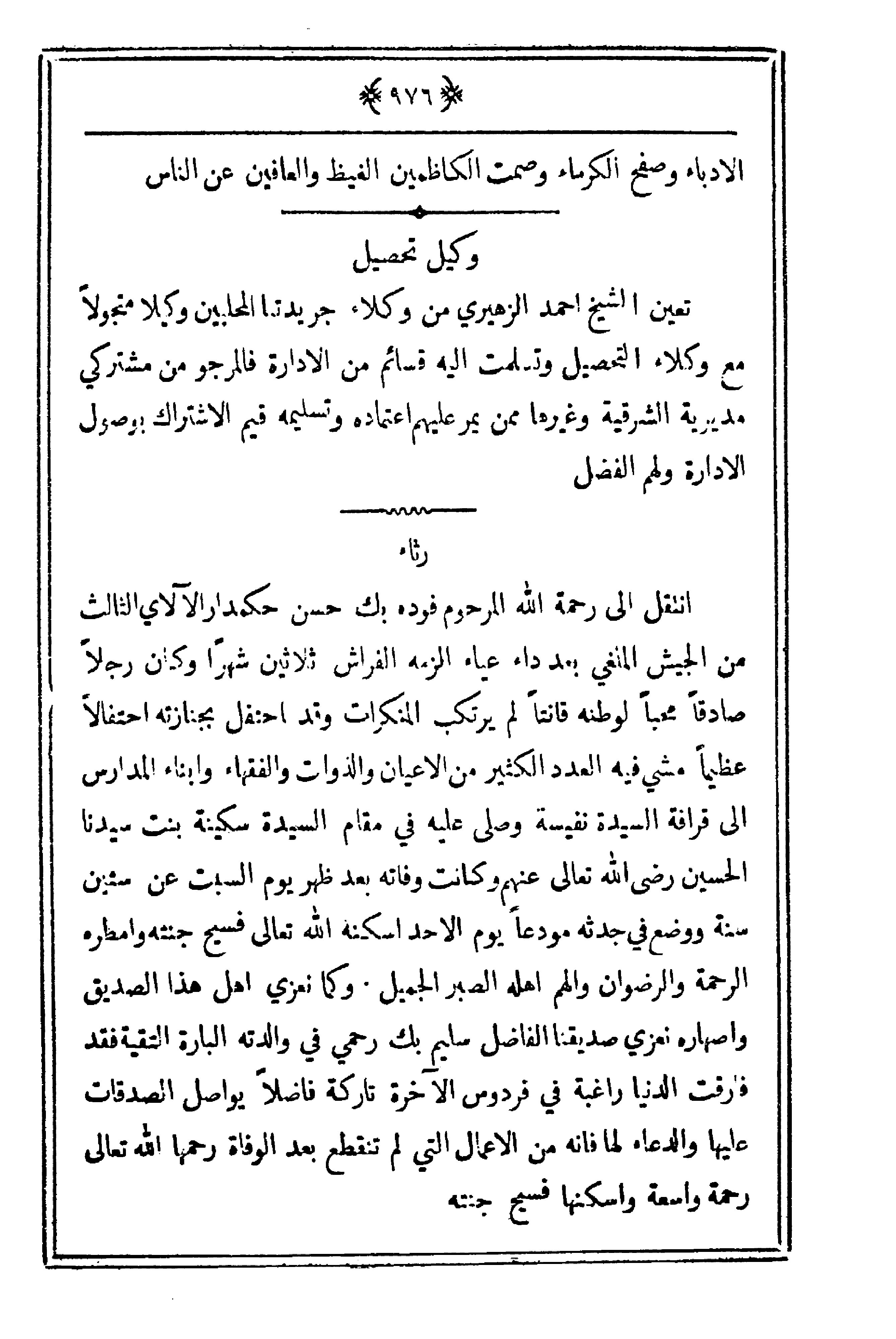 انتقل إلى رحمة الله المرحوم فوده بك حسم حمدار الآلاي الثالث من الجيش الملغي بعد داء إعياء ألزمه الفراش ثلاثين شهراً وكان رجلاً صادقاً محباً لوطنه قانتاً لم يرتكب المنكرات وقد احتفل بجنازته احتفالاً عظيماً مشي فيه العدد الكثير من الأعيان والذوات والفقهاء وأبناء المدارس إلى قرافة السيدة نفيسة وصلى عليه في مقام السيدة سكينة بنت سيدنا الحسين رضي الله تعالى عنهم وكانت وفاته بعد ظهر يوم السبت عن ستين سنة ووضع في جدثه مودعاً يوم الأحد أسكنه الله تعالى فسيح جنته وأمطره الرحمة والرضوان والهم أه8له الصبر الجميل. وكما نعزي أهل هذا الصديق وأصهاره نعزي صديقنا الفاضل سليم بك رحمي في والدته البارة التقية فقد فارقت الدنيا راغبة في فردوس الآخرة تاركة فاضلاً يواصل الصدقات عليها والدعاء لها فإنه من الأعمال التي لم تنقطع بعد الوفاة رحمها الله تعالى رحمة واسعة وأسكنها فسيح جنته.