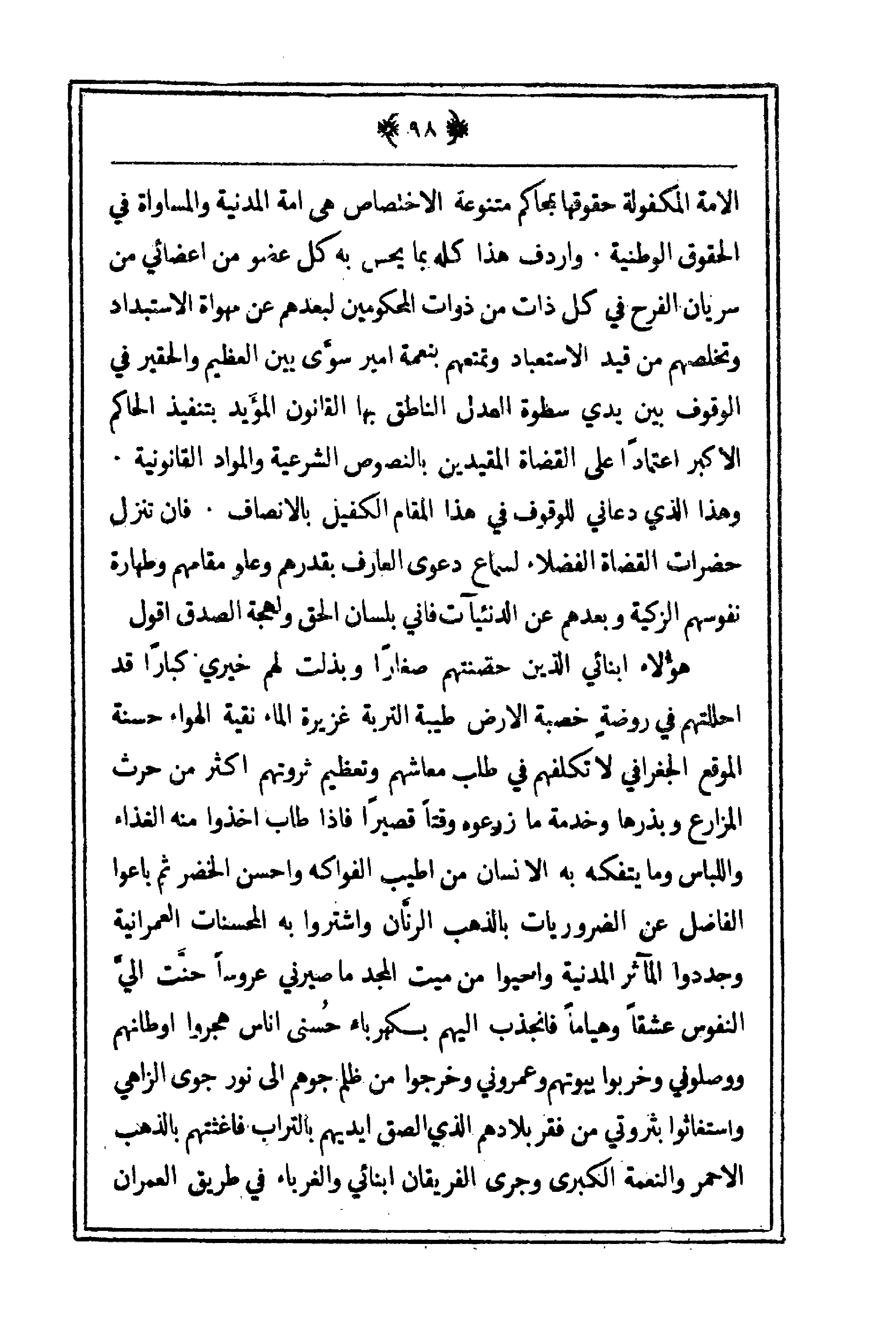 الأمة المكفولة حقوقها بمحاكم متنوعة الاختصاص هي أمة المدنية والمساواة في الحقوق الوطنية. وأردف هذا كله بما يحس به كل عضو من أعضائي من سريان الفرح في كل ذات من ذوات المحكومين لبعدهم عن مهواة الاستبداد وتخلصهم من قيد الاستعباد وتمتعهم بنعمة أمير سوّى بين العظيم والحقير في الوقوف بين يدي سطوة العدل الناطق بها القانون المؤيد بتنفيذ الحاكم الأكبر اعتماداً على القضاة المقيدين بالنصوص الشرعية والمواد القانونية. وهذا الذي دعاني للوقوف في المقام الكفيل بالإنصاف. فإن تنزل حضرات القضاة الفضلاء لسماع دعوى العارف بقدرهم وعلو مقامهم وطهارة نفوسهم الزكية وبعدهم عن الدنئيات فإني بلسان الحق ولهجة الصدق أقول: