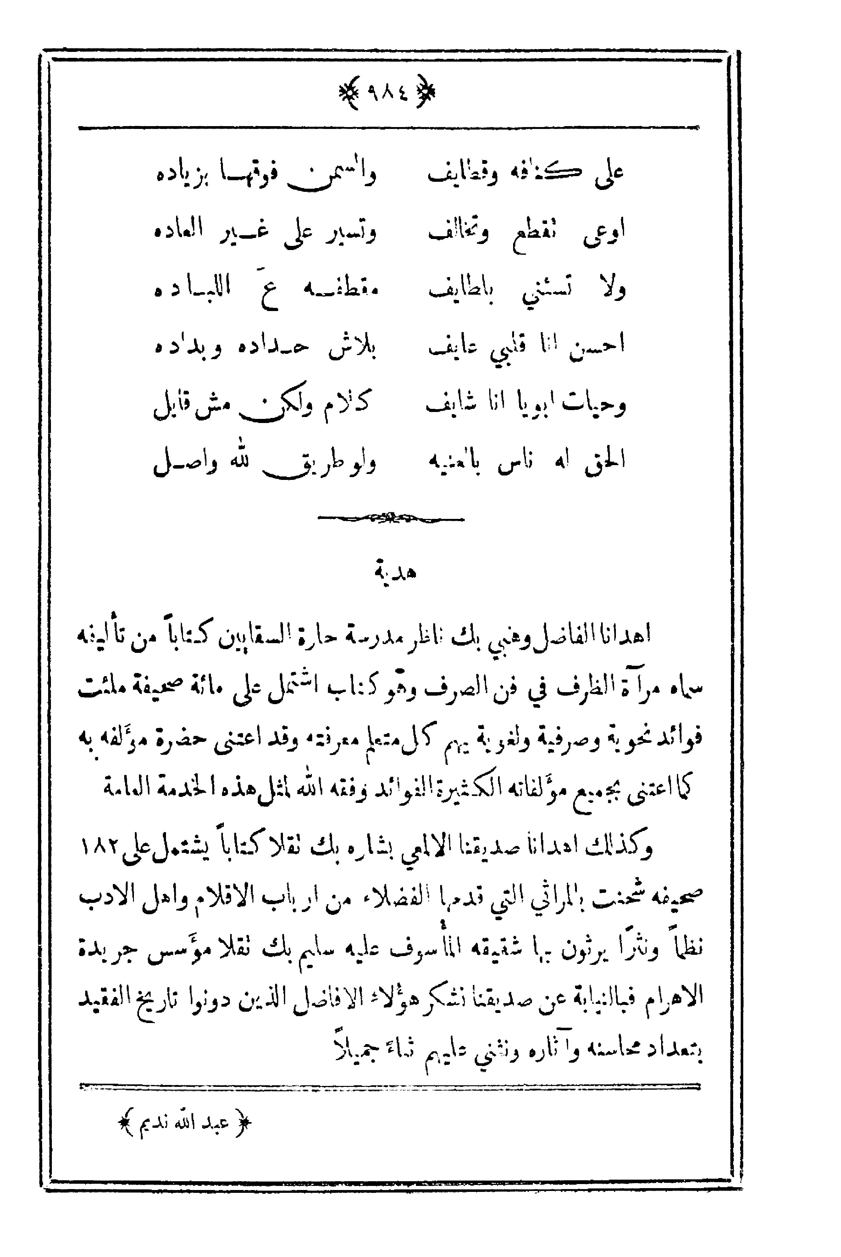 أهدانا الفاضل وهبي بك ناظر مدرسة حارة السقايين كتاباً من تأليفه سماه مرآة الظرف في فن الصرف وهو كتاب أشتمل على مائة صحيفة ملئت فوائد نحوية وصرفية ولغوية يهم كل متعلم معرفته وقد اعتنى حضرة مؤلفه به كما اعتنة بجميع مؤلفاته الكثيرة الفوائد وفقه الله لمثل هذه الخدمة العامة.
