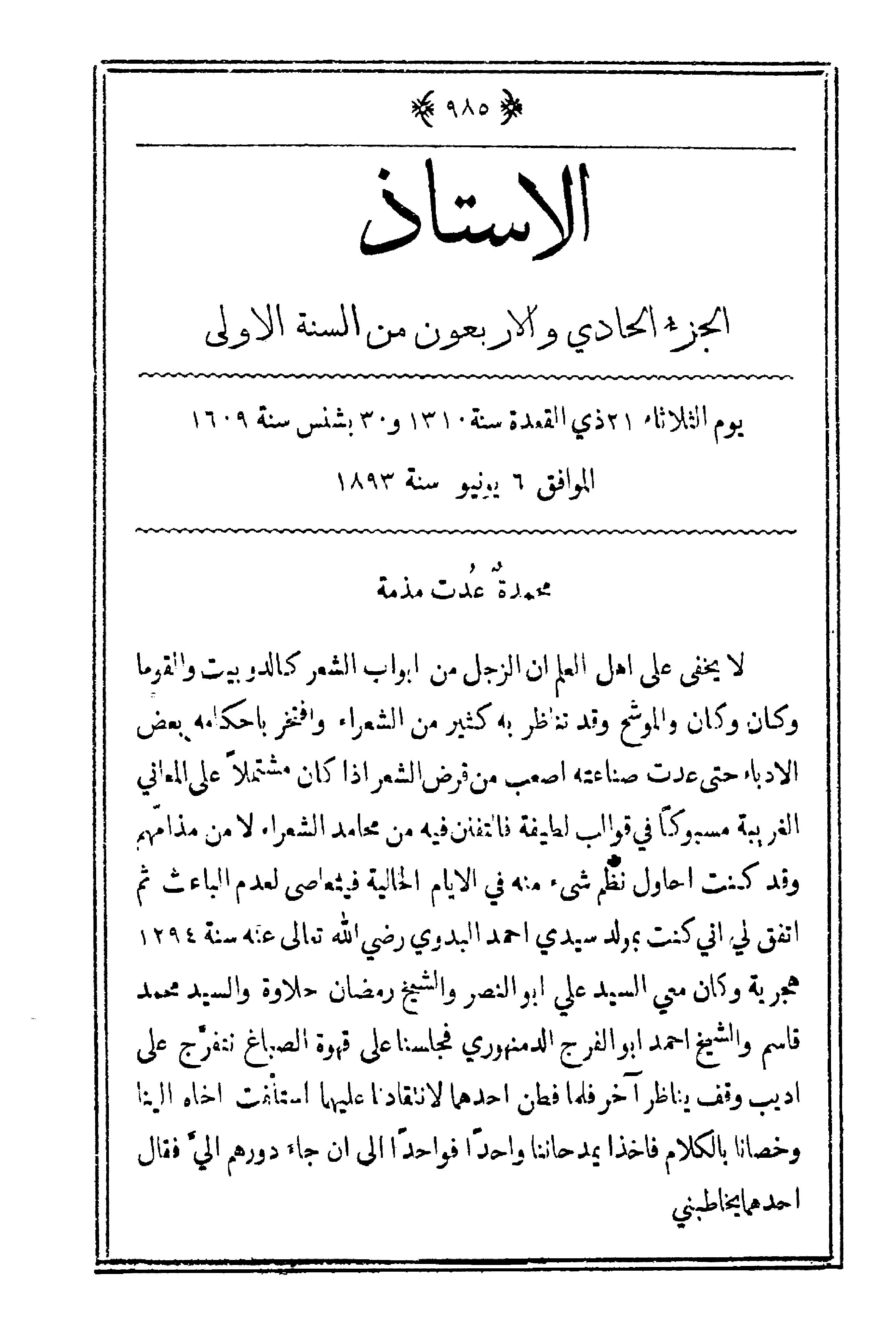 لا يخفى على أهل العلم أن الزجل من أبواب الشعر كالدوبيت والقوما وكان وكان والموشح موقد تناظر به كثير من الشعراء وافتخر بأحكامه بعض الأدباء حتى عدت صناعته أصعب من قرض الشعر إذا كان مشتملاً على المعاني الغريبة مسبوكاً في قوالب لطيفة فالتفنن فيه من محامد الشعراء لا من مذامّهم وقد كنت أحاول نظم شيء منه في الأيام الخالية فيتعاصى لعدم الباعث ثم اتفق لي أني كنت بمولد سيدي أحمد البدوي رضي الله تعالى عنه سنة 1294 هجرية وكان معي السيد علي أبو النصر والشيخ رمضان حلاوة والسيد محمد قاسم والشيخ أحمد أبو الفرج الدمنهوري فجلسنا على قهوة الصباغ نتفرّج على أديب وقف يناظر آخر فلما فطن أحدهما لانتقادنا عليهما استأنف أخاه إلينا وخصانا بالكلام فأخذا يمدحاننا واحداً فواحداً إلى أن جاء دورهم إليَّ فقال أحدهما يخاطبني