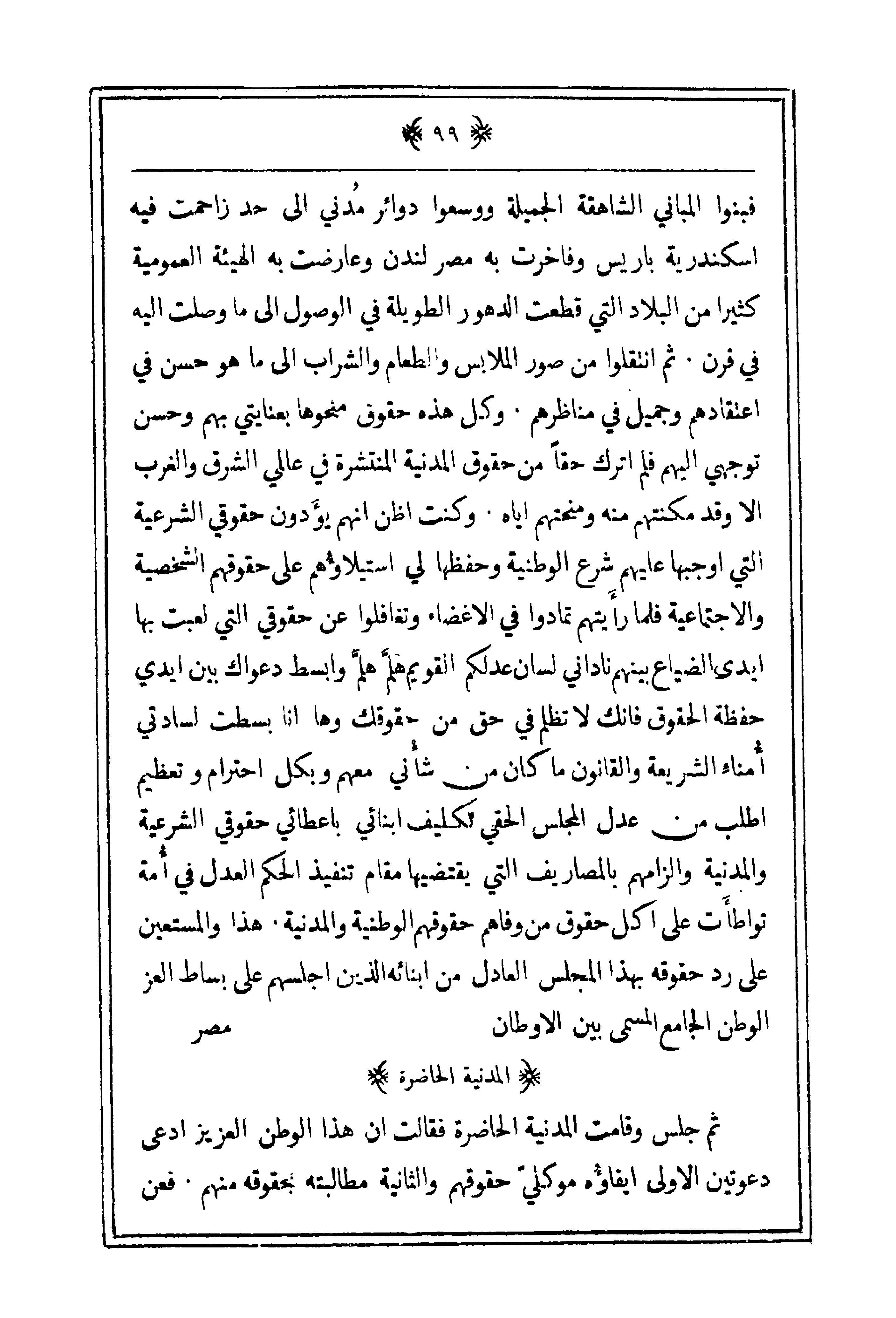 فبنوا المباني الشاهقة الجميلة ووسعوا دوائر مُدني إلى حد زاحمت فيه إسكندرية باريس وفاخرت به مصر لندن وعارضت به الهيئة العمومية كثيراً من البلاد التي قطعت الدهور الطويلة في الوصول إلى ما وصلت إليه في قرن. ثم انتقلوا من صور الملابس والطعام والشراب إلى ما هو حسن في اعتقادهم وجميل في مناظرهم. وكل هذه حقوق منحوها بعنايتي بهم وحسن توجهي إليهم فلم أترك حقاً من حقوق المدنية المنتشرة في عالمي الشرق والغرب إلا وقد مكنتهم منه ومنحتهم إياه. وكنت أظن أنهم يؤدون حقوقي الشرعية التي أوجبها عليهم شرع الوطنية وحفظها لي استيلاؤهم على حقوقهم الشخصية والاجتماعية فلما رأيتهم تمادوا في الإغضاء وتغافلوا عن حقوقي التي لعبت بها أيدي الضياع بينهم ناداني لسان عدلكم القويم هلّم هلّم وأبسط دعواك بين أيدي حفظة الحقوق فإنك لا تظلم في حق من حقوقك وها أنا بسطت لسادتي أُمناء الشريعة والقانون ما كان من شأني معهم وبكل احترام وتعظيم أطلب من عدل المجلس الحقي تكليف أبناء بإعطائي حقوقي الشرعية والمدنية وإلزامهم بالمصاريف التي يقتضيها مقام تنفيذ الحكم العدل في أمة تواطأت على أكل حقوق من وفاهم حقوقهم الوطنية والمدنية. هذا والمستعين على رد حقوقه بهذا المجلس العادل من أبنائه الذين أجلسهم على بساط العز الوطن الجامع المسمى بين الأوطان مصر.