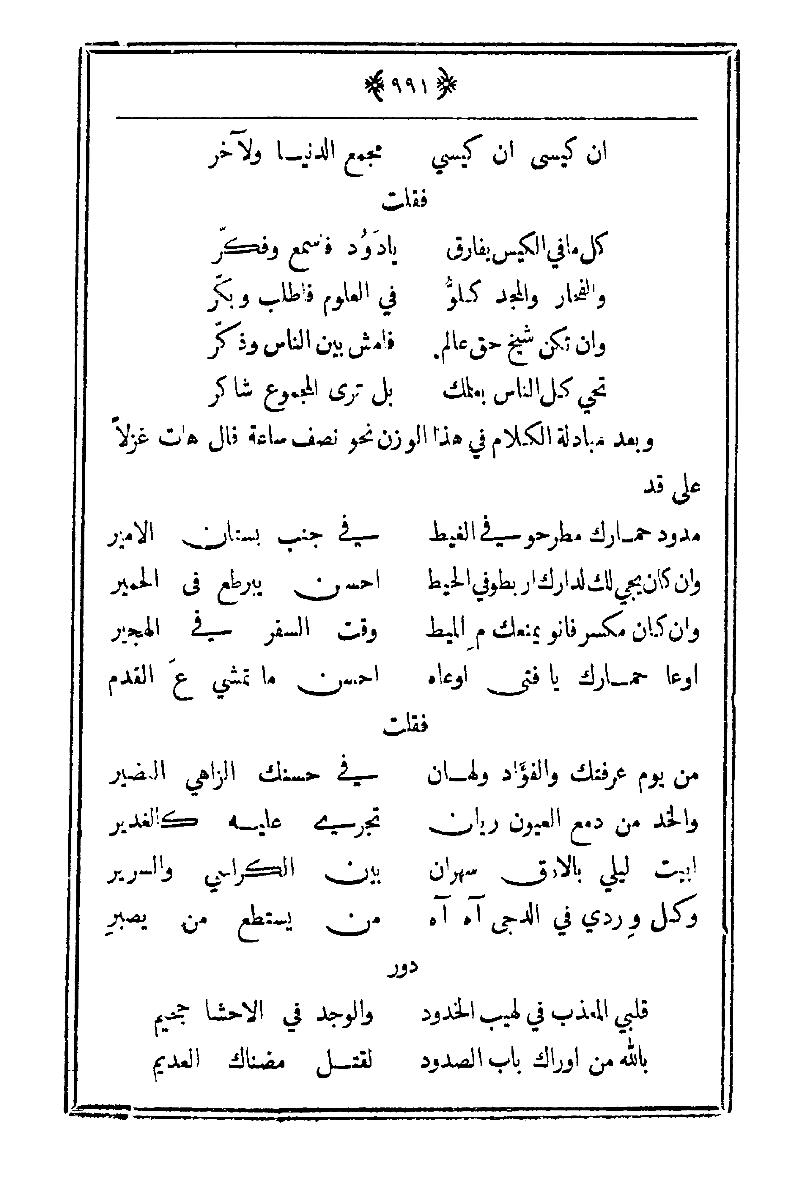 وبعد مبادلة الكلام في هذا الوزن نحو نصف ساعة قال هات عزلاً على قد: