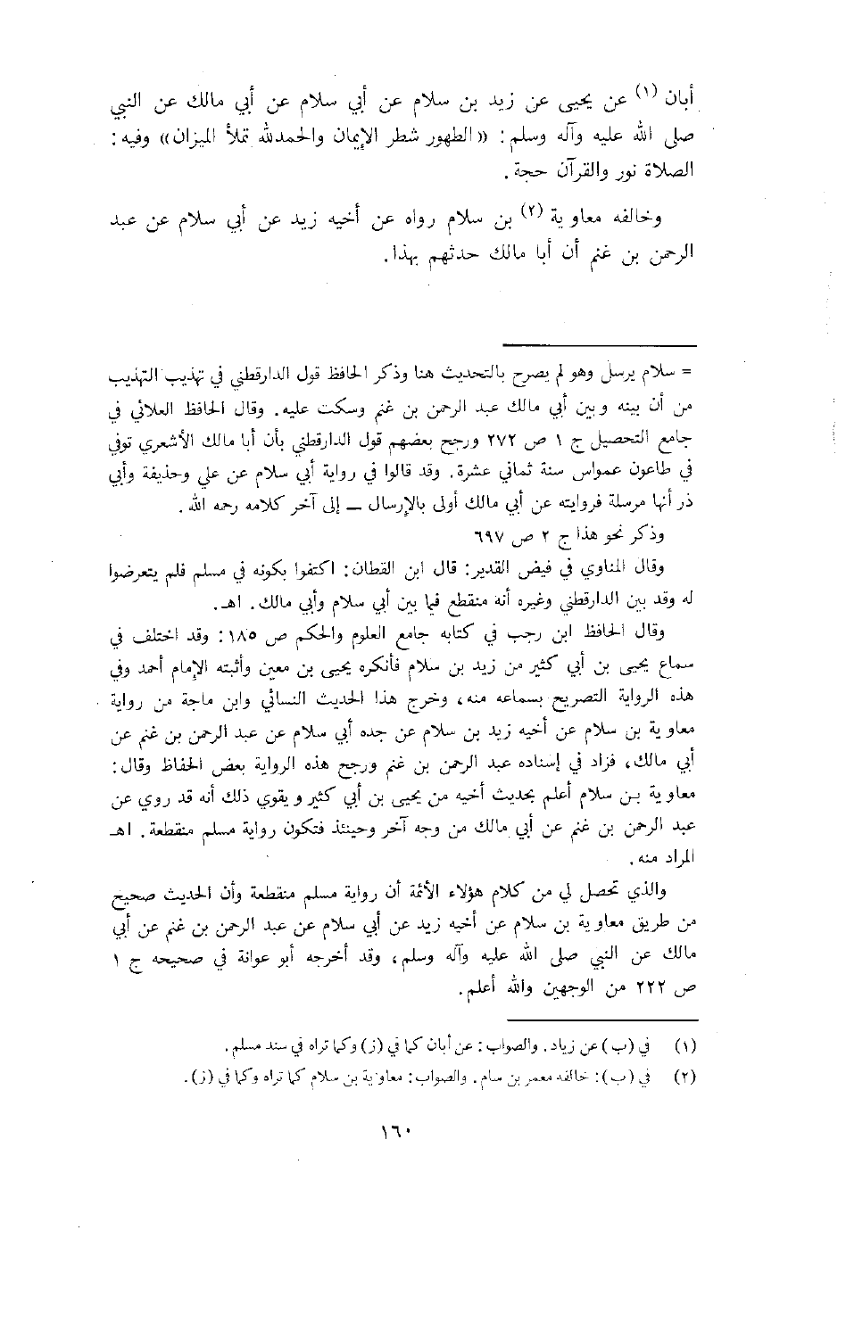 أبان عن يحيى عن زيد بن سلام عن أبي سلام عن أبي مالك عَنِ النَّبِيِّ (صَلَّى اللَّهُ عَلَيْهِ وسلم) : "الطهور شطر الإيمان والحمدلله تملأ الميزان" وفيه: الصلاة نور والقرآن حجة.