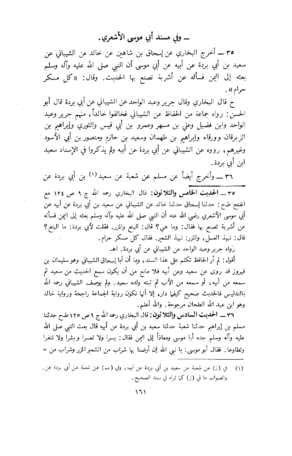 35 - أخرج البخاري عن إسحاق بن شاهين عن خالد عن الشيباني عن سعيد بن أبي بردة عن أبيه عن أبي موسى أن النبي (صلى الله عليه وسلم) بعثه إلى اليمن فسأله عن أشربة تصنع بها الحديث. وقال: "كل مسكر حرام".