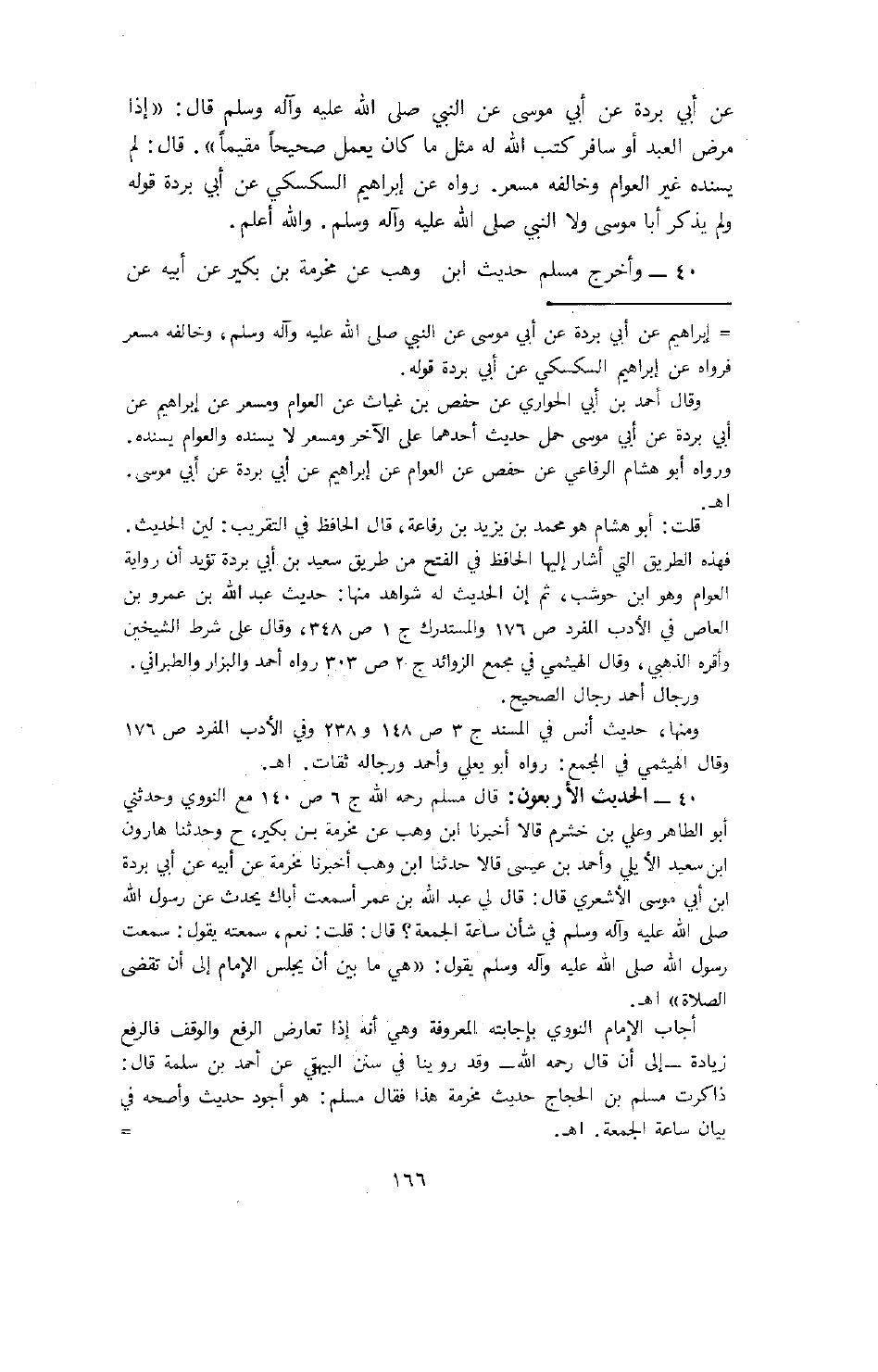 عن أبي بردة عن أبي موسى عَنِ النَّبِيِّ (صَلَّى اللَّهُ عَلَيْهِ وسلم) قال: "إذا مرض العبد أو سافر كتب الله له مثل ما كان يعمل صحيحاً مقيماً". قال: لم يسنده غير العوام وخالفه مسعر. رواه عن إبراهيم السكسكي عن أبي بردة قوله ولم يذكر أبا موسى ولا النبي (صلى الله عليه وسلم) . والله أعلم.