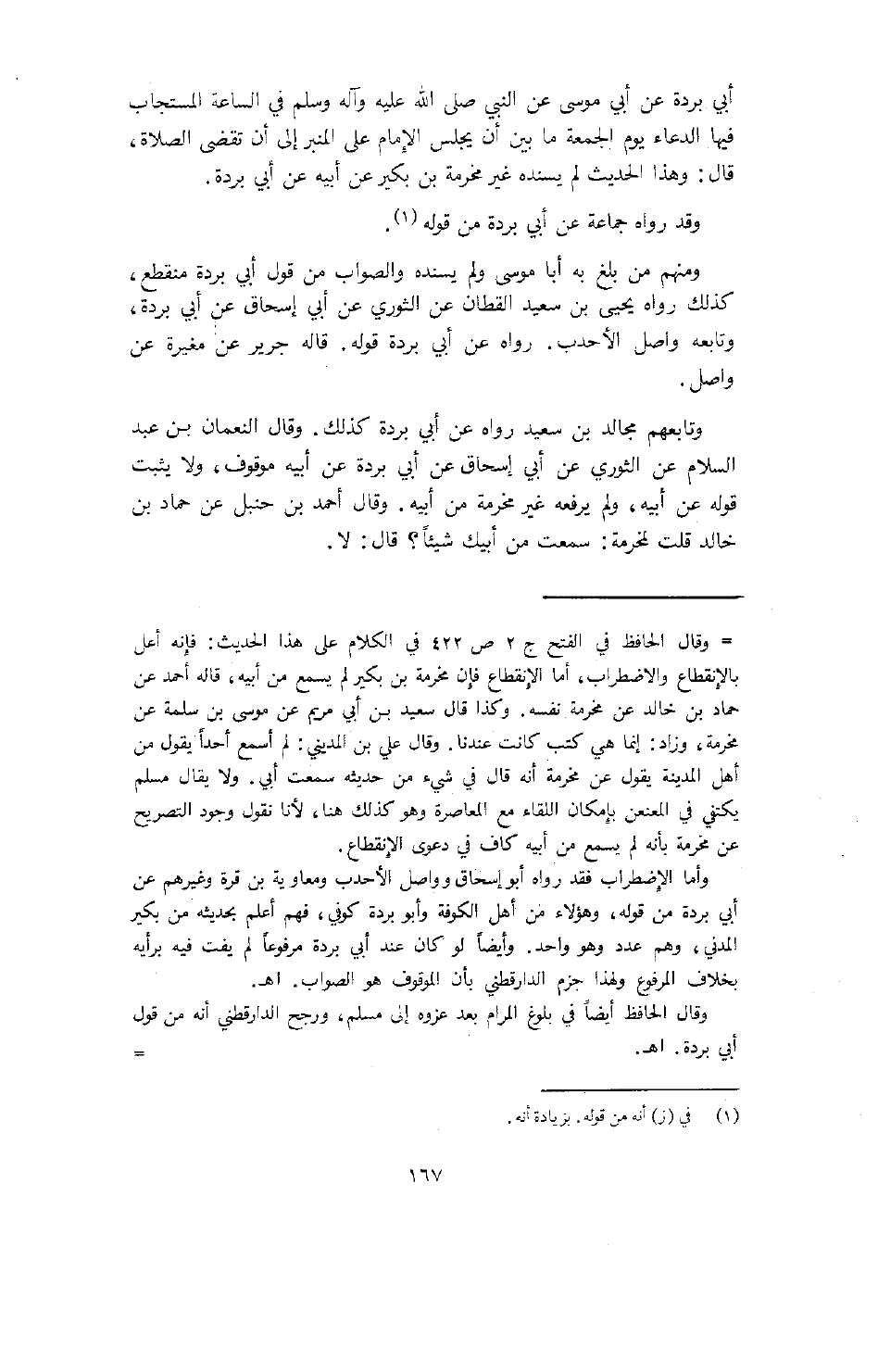 أبي بردة عن أبي موسى عَنِ النَّبِيِّ (صَلَّى اللَّهُ عَلَيْهِ وسلم) في الساعة المستجاب فيها الدعاء يوم الجمعة ما بين أن يجلس الإمام على المنبر إلى أن تقضى الصلاة، قال: وهذا الحديث لم يسنده غير مخرمة بن بكير عن أبية عن أبي بردة.
