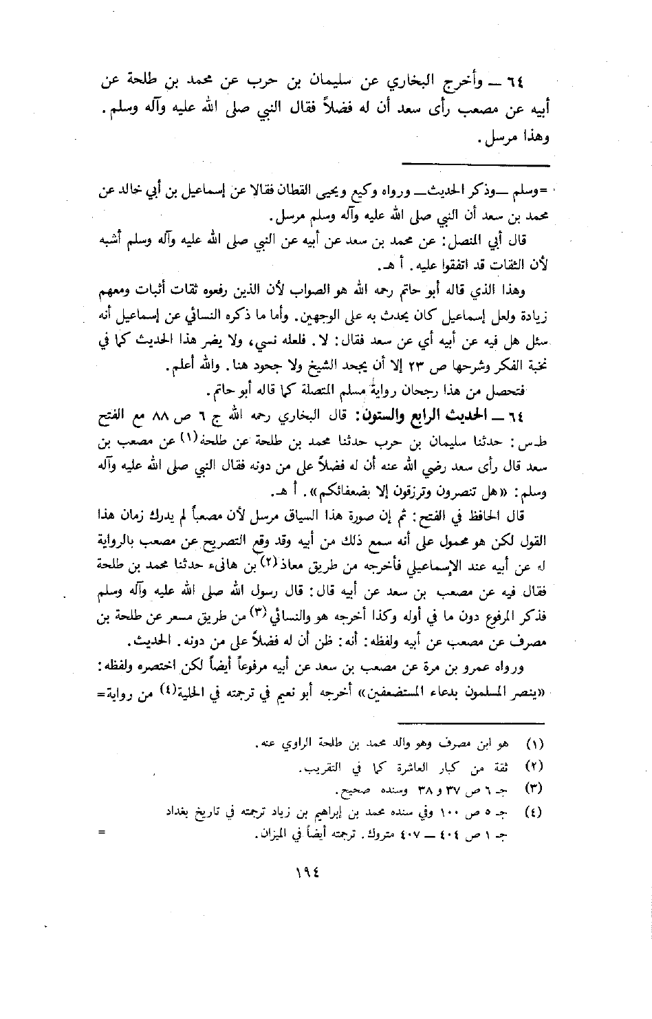64 - وأخرج البخاري عن سليمان بن حرب عن محمد بن طلحة عن أبيه عن مصعب رأى سعد أن له فضلاًِ فقال النبي (صلى الله عليه وسلم) . وهذا مرسل.