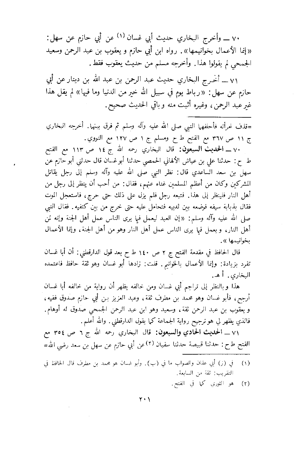 70 - وأخرج البخاري حديث أبي غسان عن أبي حازم عن سهل: "إنما الأعمال بخواتيمها". رواه ابن أبي حازم ويعقوب بن عبد الرحمن وسعيد الجحمي لم يقولوا هذا. وأخرجه مسلم من حديث يعقوب فقط.