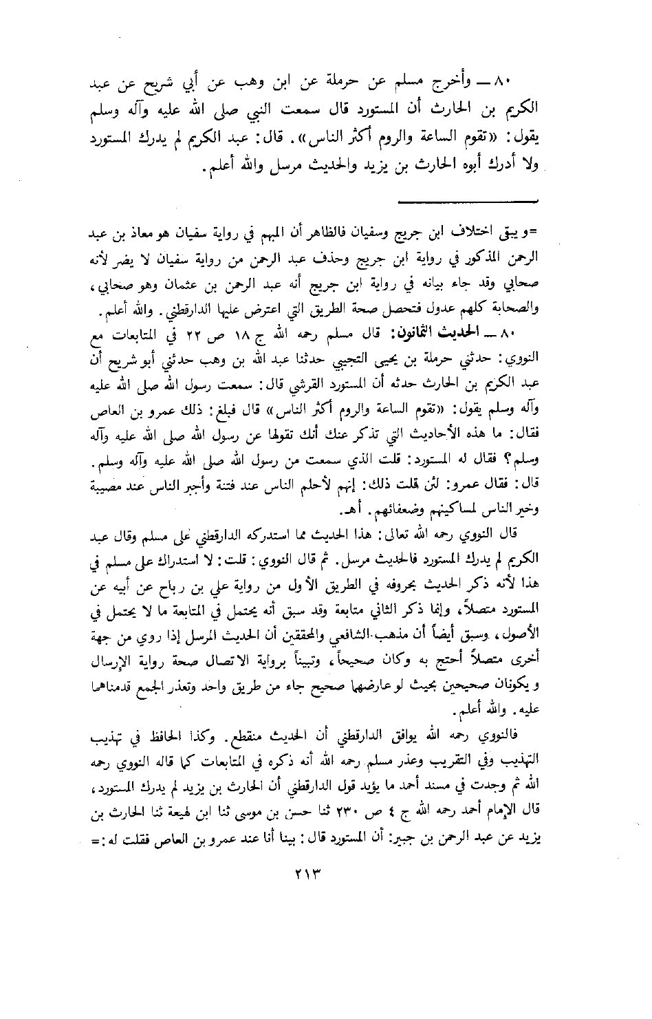 80 - وأخرج مسلم عن حرملة عن ابن وهب عن أبي شريح عن عبد الكريم بن الحارث أن المستورد قال سمعت النبي (صلى الله عليه وسلم) ويقول: "تقوم الساعة والروم أكثر الناس". قال: عبد الكريم لم يدرك المستورد ولا أدرك أبوه الحارث بن يزيد والحديث مرسل والله أعلم.
