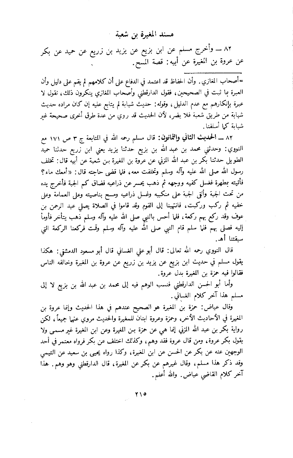 82 - وأخرج مسلم عن ابن بزيع عن يزيد بن زريع عن حميد عن بكر عن عروة بن المغيرة عن أبيه: قصة المسح.