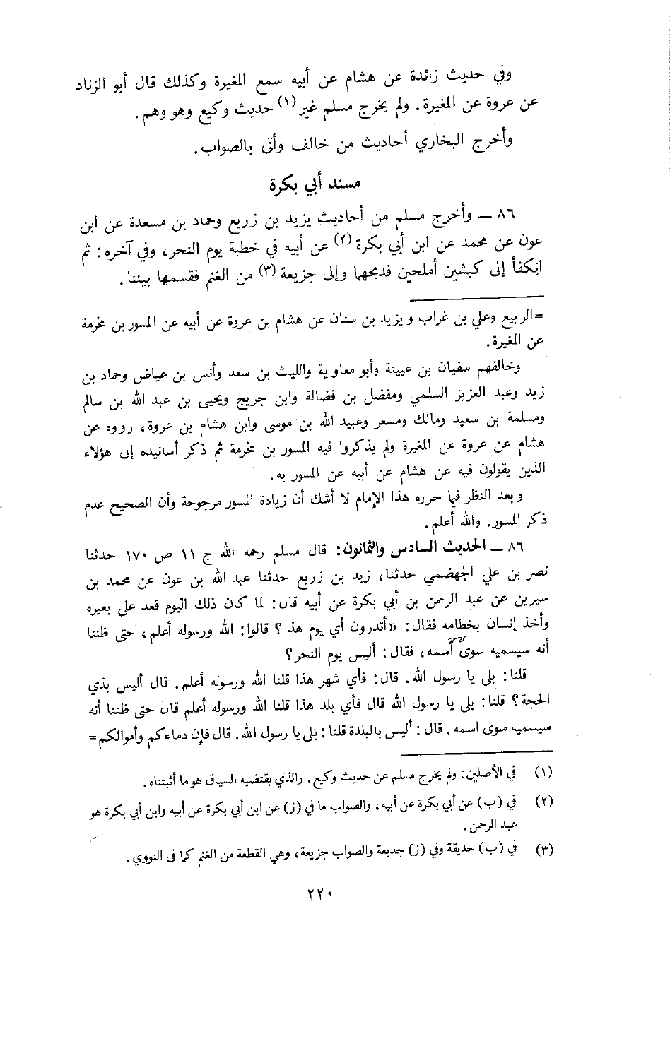 86 - وأخرج مسلم من أحاديث يزيد بن زريع وحماد بن مسعدة عن ابن عون عن محمد عن ابن أبي بكرة عن أبيه في خطبة يوم النحر، وفي آخره: ثم انكفأ إلى كبشين أملحين فذبحهما وإلى جزيعة من الغنم فقسمهما بيننا.