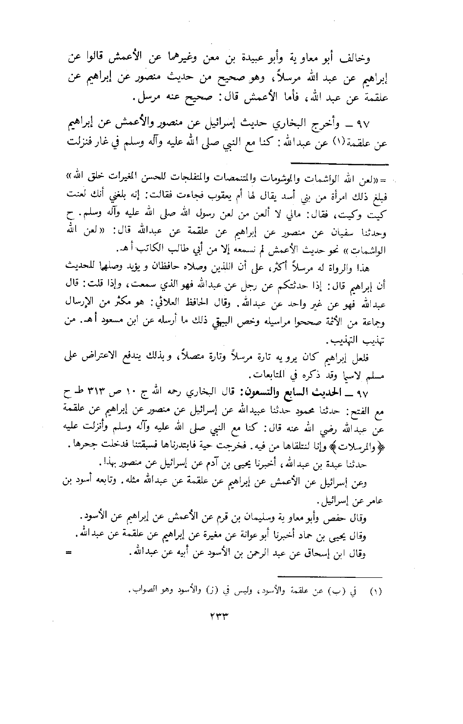 97- وأخرج البخاري حديث إسرائيل عن منصور والأعمش عن إبراهيم عن علقمة عن عبد الله: كنا مع النبي (صلى الله عليه وسلم) في غار فنزلت