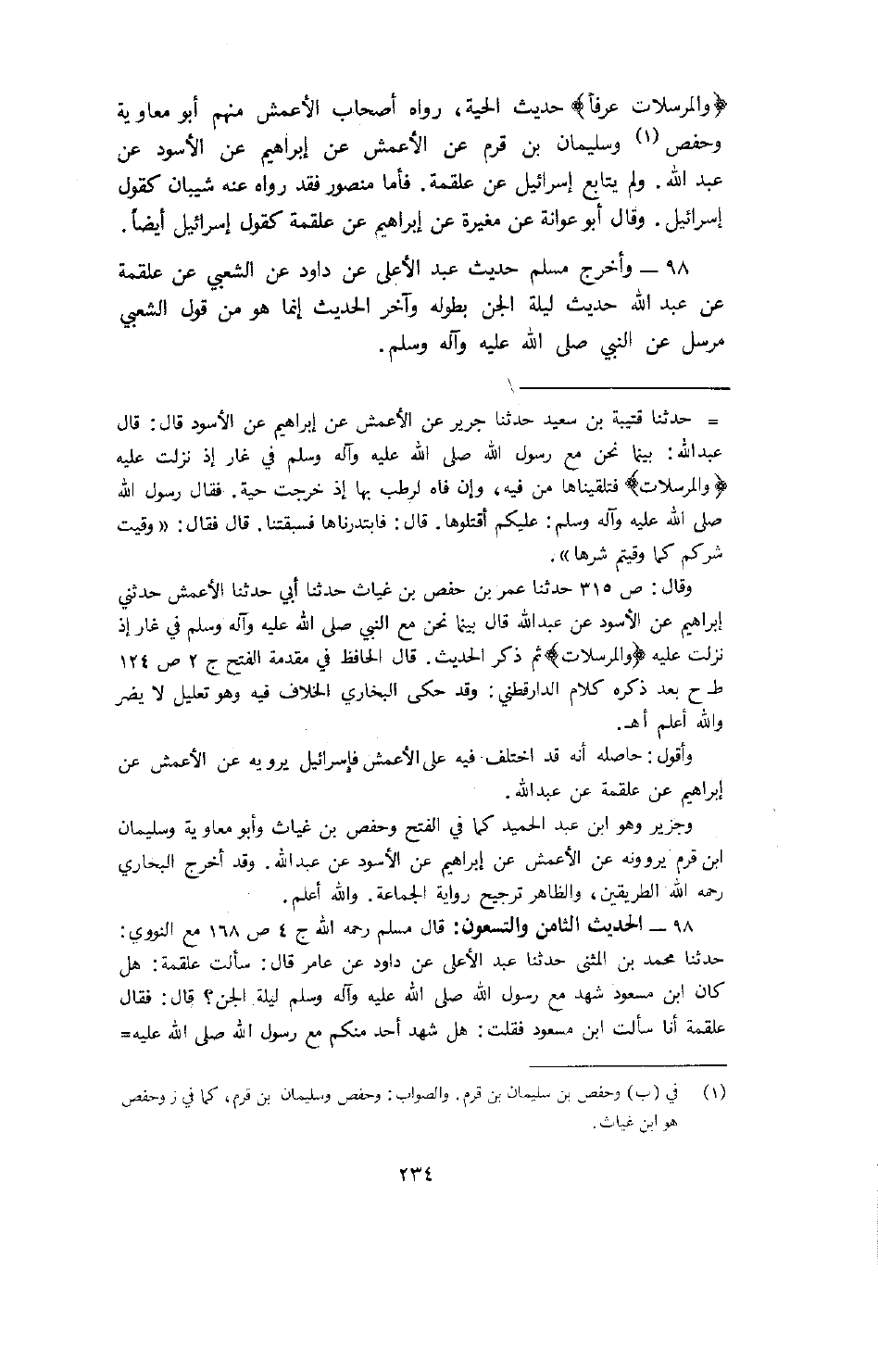 98- وأخرج مسلم حديث عبد الأعلى عن داود عن الشعبي عن علقمة عن عبد الله حديث ليلة الجن بطوله وآخر الحديث إنما هو من قول الشعبي مرسل عن النبي (صلى الله عليه وسلم) .