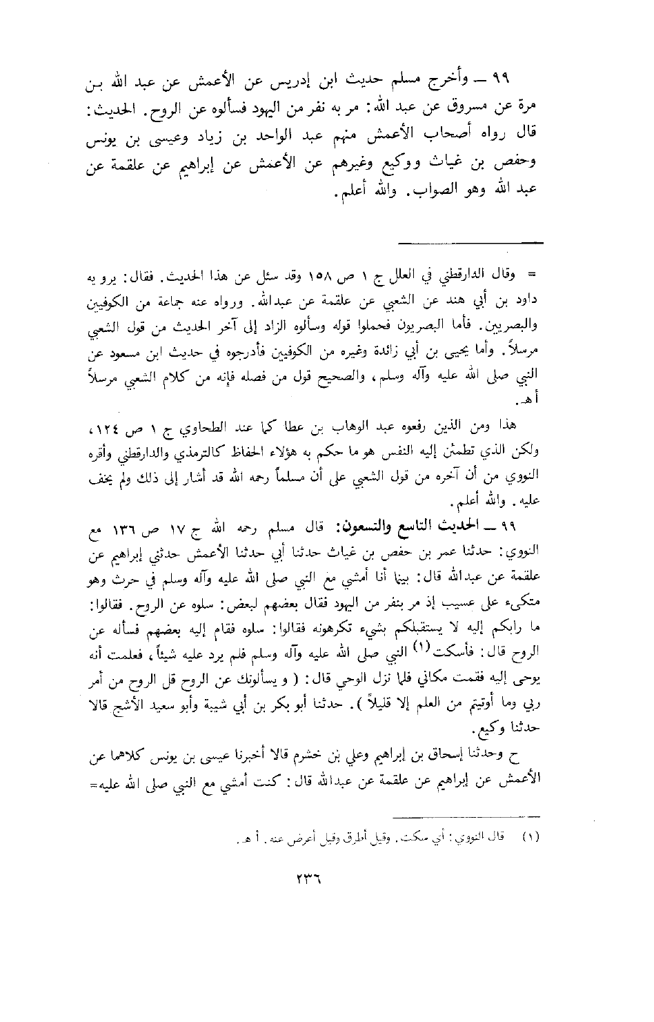 99- وأخرج مسلم حديث ابن إدريس عن الأعمش عن عبد الله بن مرة عن مسروق عن عبد الله: مر به نفر من اليهود فسألوه عن الروح. الحديث: قال رواه أصحاب الأعمش منهم وغيرهم منهم عبد الواحد بن زياد وعيسى بن يونس وحفص بن غياث ووكيع وغيرهم عن الأعمش عن إبراهيم عن علقمة عن عبد الله وهو الصواب. والله أعلم.