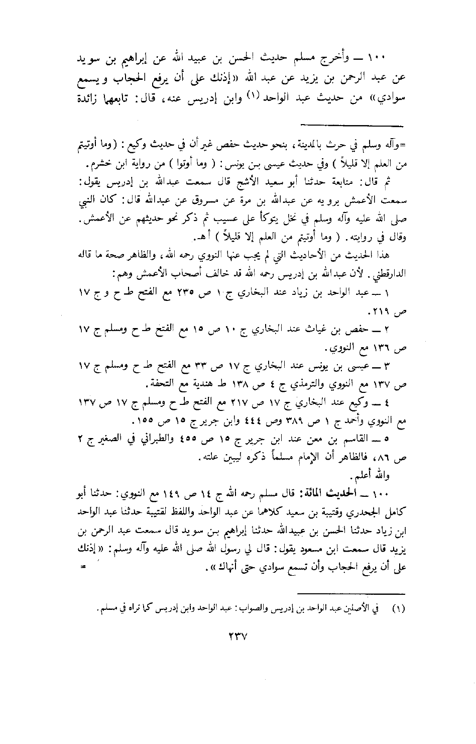 100- وأخرج مسلم حديث الحسن بن عبيد الله عن إبراهيم بن سويد عن عبد الرحمن بن يزيد عن عبد الله "إذنك على أن يرفع الحجاب ويسمع سوادي" من حديث عبد الواحد وابن إدريس عنه، قال: تابعهما زائدة