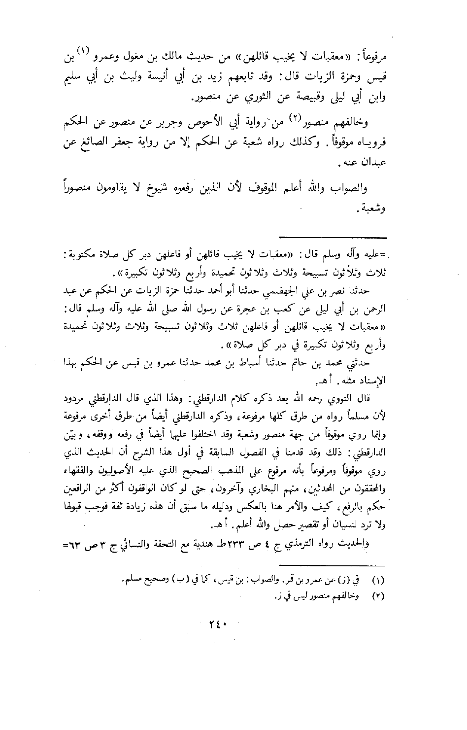 مرفوعاً: "معقبات لا يخيب قائلهن" من حديث مالك بن مغول وعمرو بن قيس وحمزة الزيات قال: وقد تابعهم زيد بن أبي أنيسة وليث بن أبي سليم وابن أبي ليلى وقبيصة عن الثوري عن منصور.