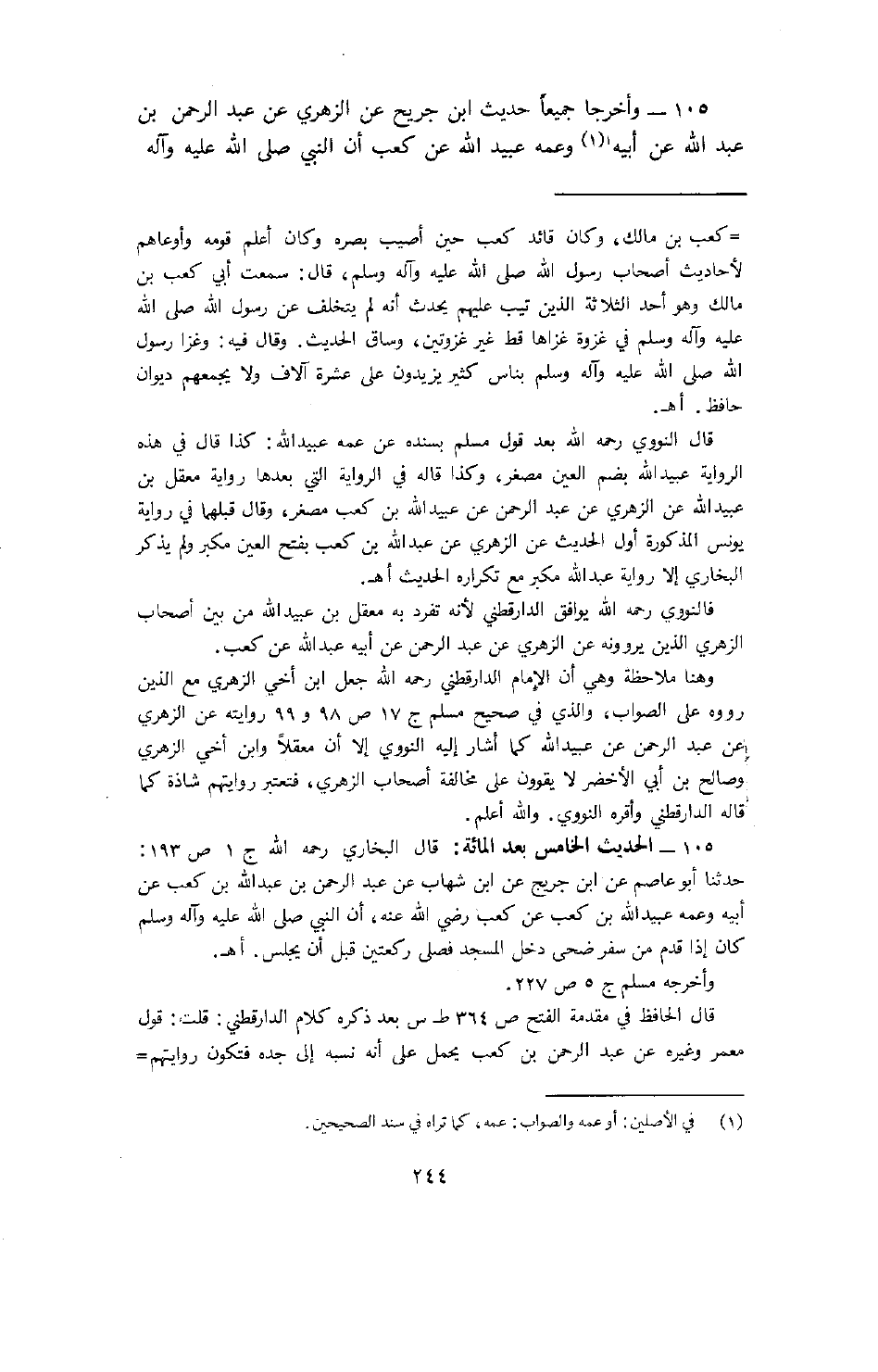 105- وأخرجا جميعاً حديث ابن جريج عن الزهري عن عبد الرحمن بن عبد الله عن أبيه وعمه عبيد الله عن كعب أن النبي (صلى الله عليه