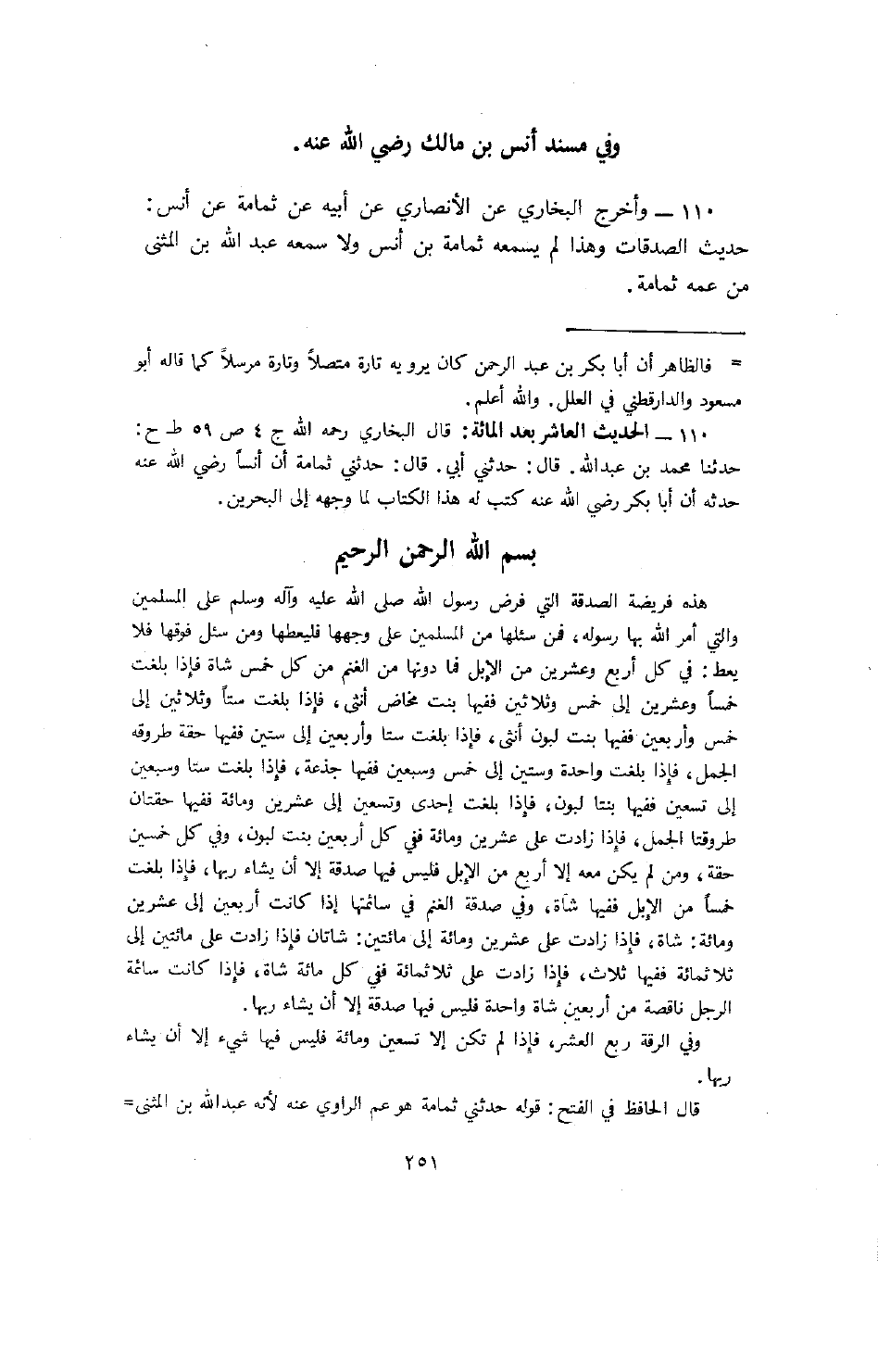 110- وأخرج البخاري عن الأنصاري عن أبيه عن ثمامة عن أنس: حديث الصدقات وهذا لم يسمعه ثمامة بن أنس ولا سمعه عبد الله بن المثنى من عمه ثمامة.